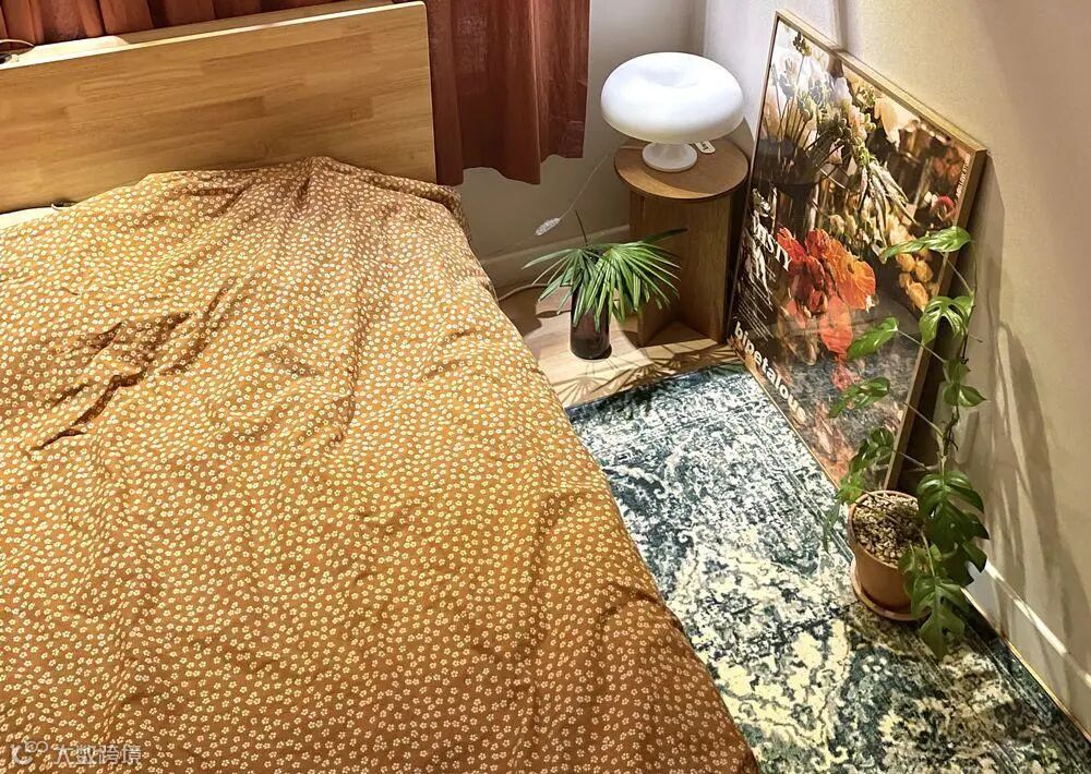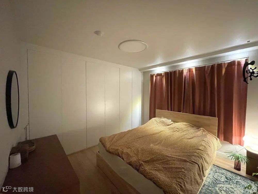 主卧空间设计得比较复古,符合女业主的喜好。姜黄色的床单搭配红棕色的窗帘,在夜晚的时候可以给这个空间提供充足的隐私性。侧边一面墙的到顶柜体,衣物都可以存储在这里。