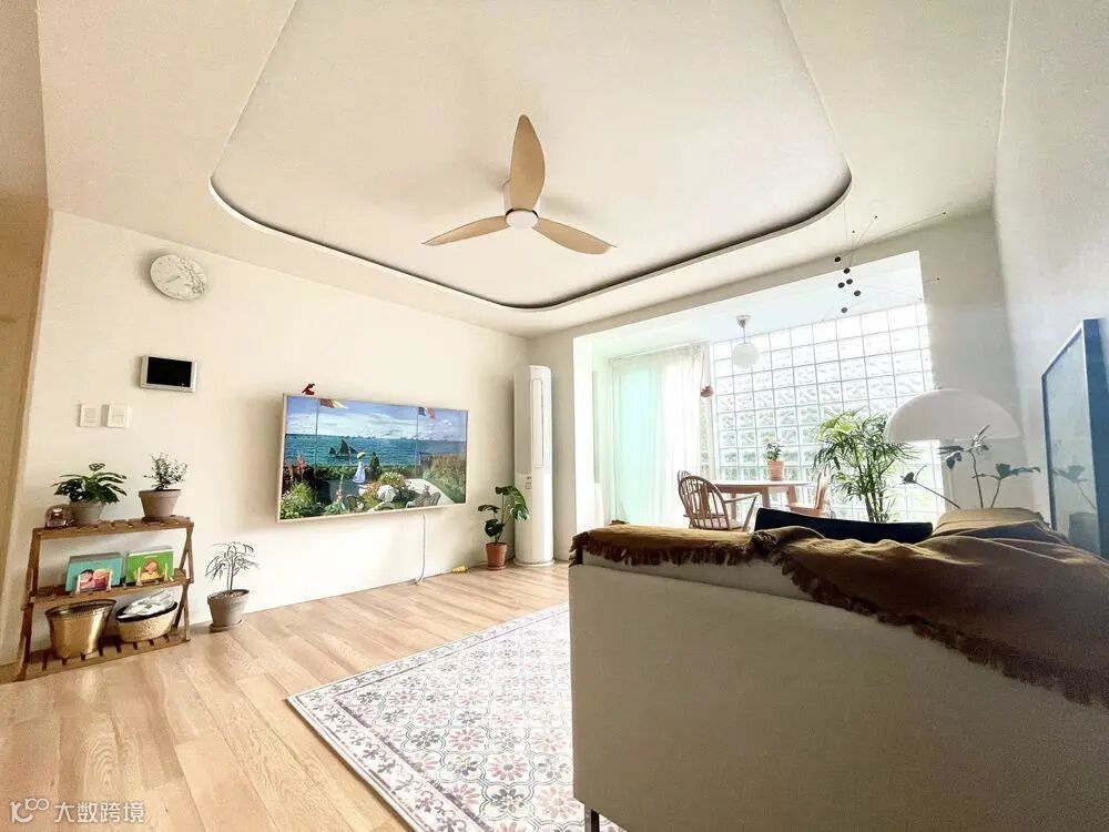 大白电视墙简单挂放电视,侧边再摆放木质花架装饰,清清爽爽但是非常耐看。上方弧形的吊顶增加整体空间的设计感,非常有特色。