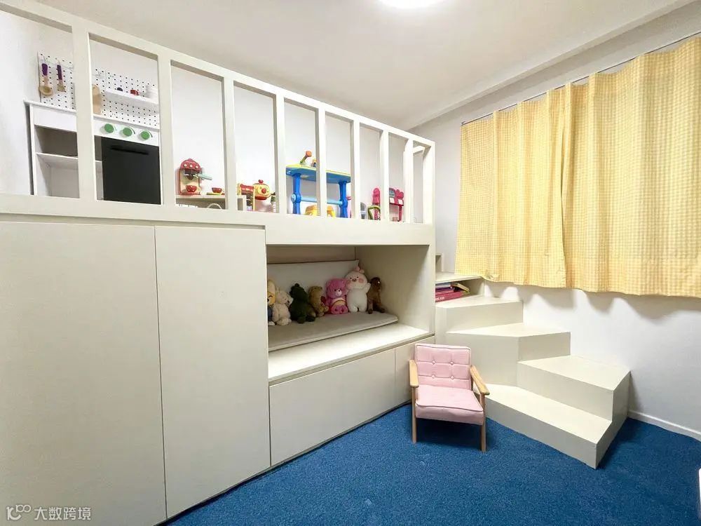 儿童房设计得非常可爱,不仅要给孩子提供睡觉休憩的地点,还要满足孩子玩耍的需求。所以打造上下铺的设计,既有玩耍的空间也有学习看书的空间,孩子看了非常喜欢。