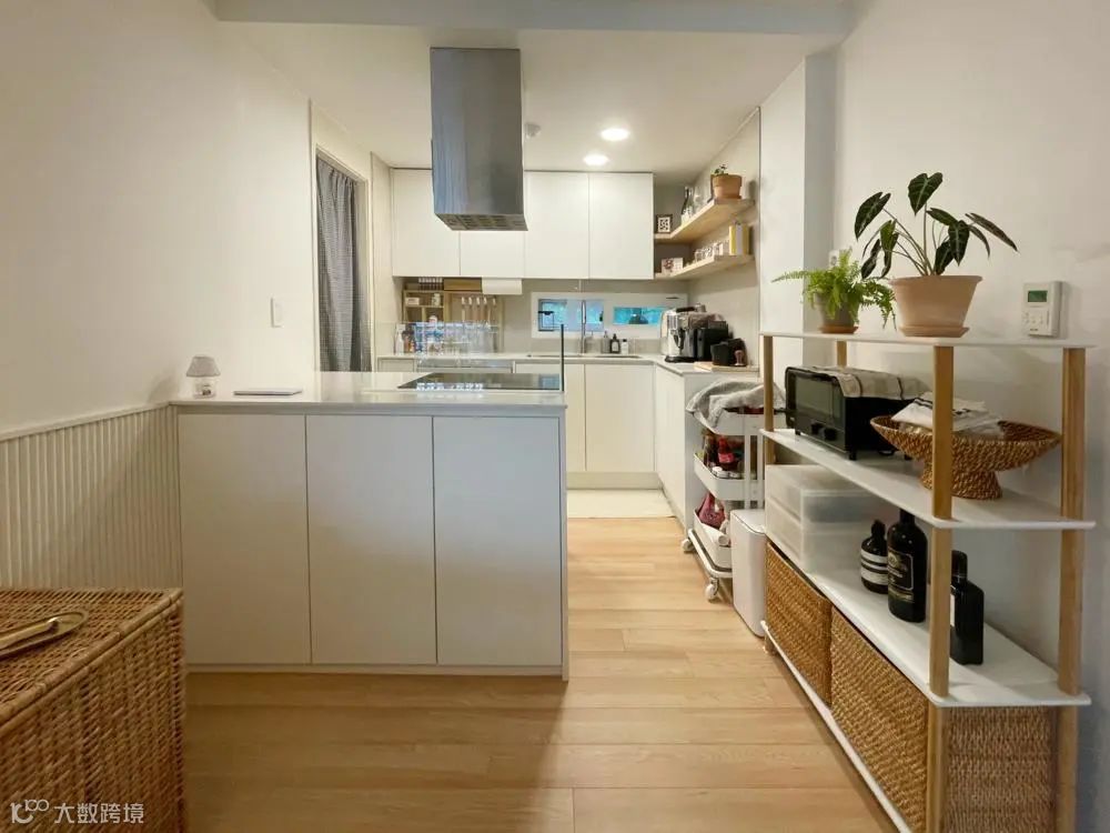 客厅另一边是开放式的厨房,利用灶台延伸出来一个隔断,刚好划分两边空间。厨房空间不算宽敞,所以需要充分利用空间。除了靠墙打造柜体以外,还增加了开放式置物架做物品存储。