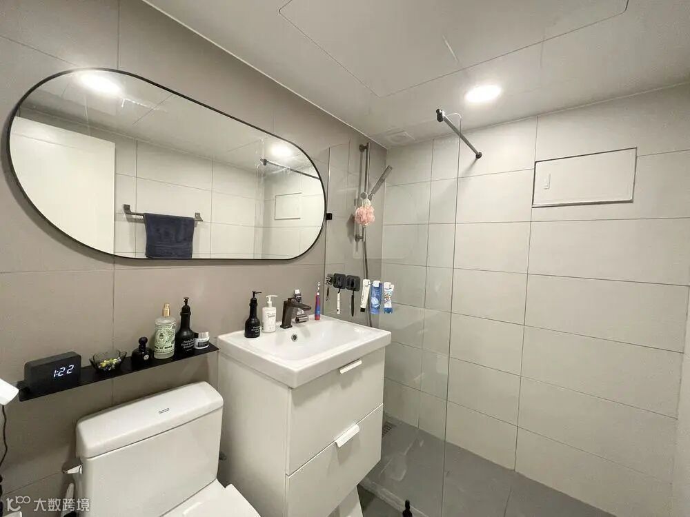 卫生间做一字型布局,马桶区+洗漱台+淋浴区,基本的功能性都能满足上。还特地给马桶区上方增加了置物架做物品存储,常用的洗漱用品都可以存放在这里,看起来会更加干净整洁。