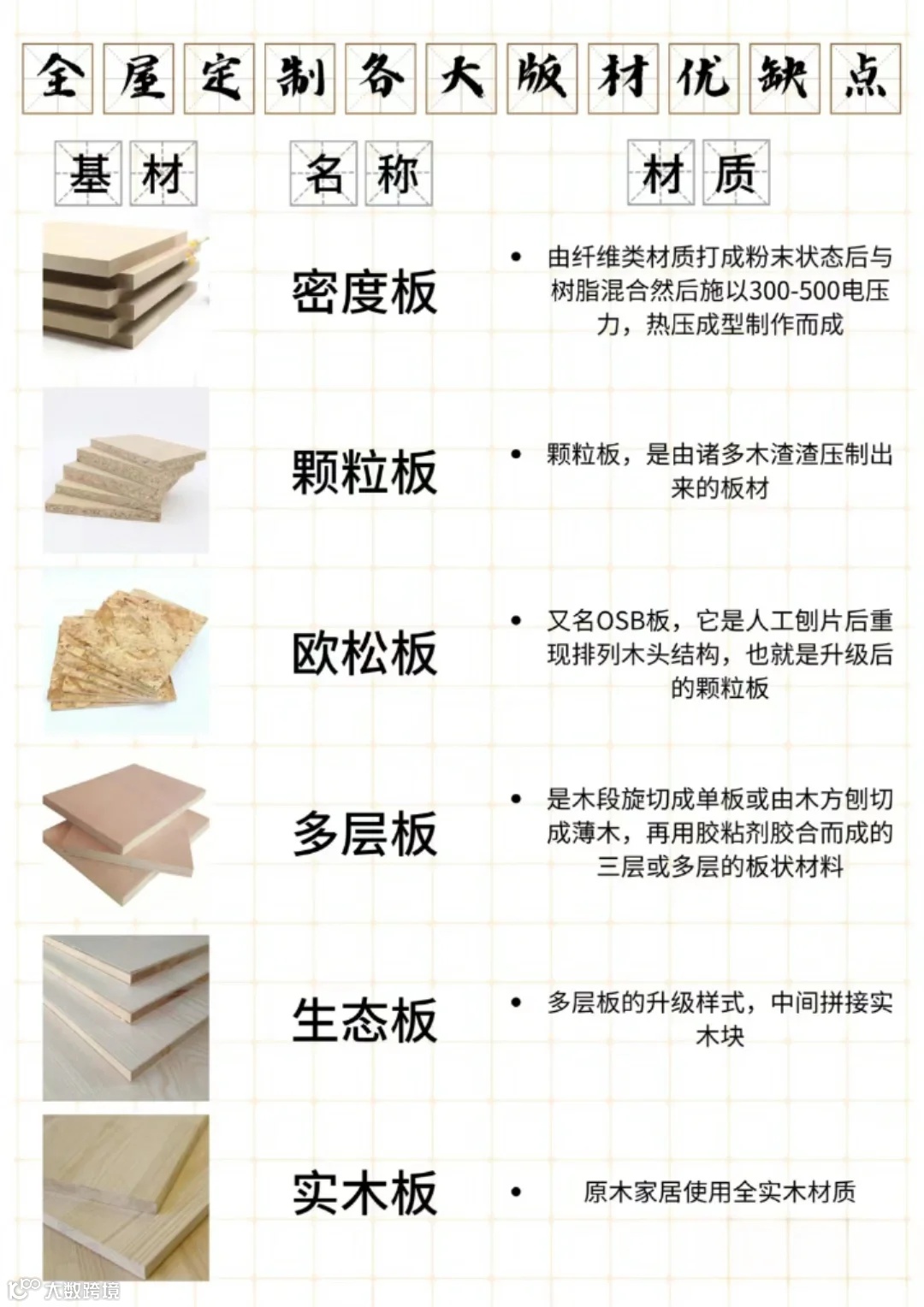 全屋定制中常用板材主要有多层板,颗粒板,密度板,欧松板,生态板,实木指接板。那么这6种板材,到底哪一种比较好呢?今天我们就来了解这6款板材优缺点,装修小白保存起来,避免踩坑哦!