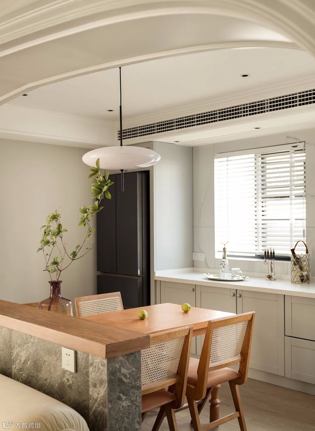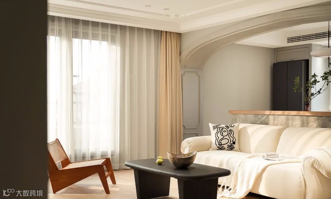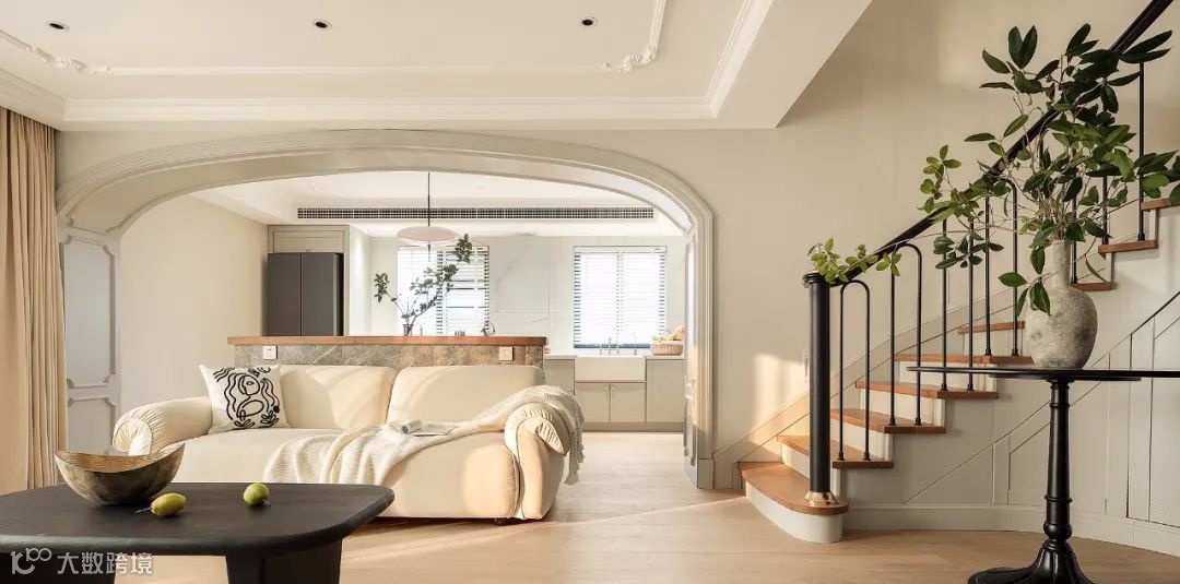 ▲ 客厅与餐厨之间通过弧形垭口过渡,奠定空间优雅格调