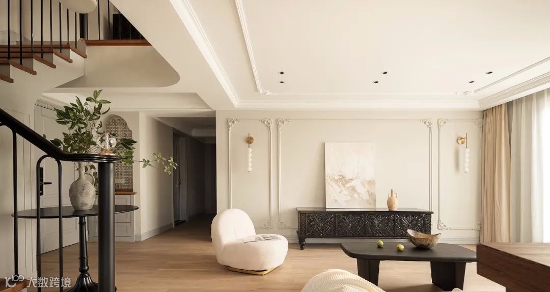▲ 客厅以奶油色为主,墙顶面加入雕花石膏线条勾勒,将空间精致度提升一个档次