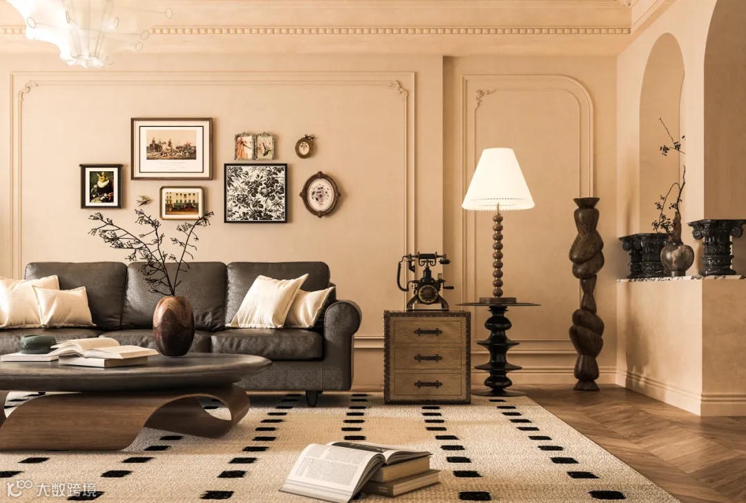 棕色焦糖与杏色卡其搭配总给人一种温馨的静谧感,钻石绒艺术漆在光线下透露出微微的斑驳光影,黑白棋盘地毯点缀其中,复古黑铜落地灯,在古典、沉浸、内敛的空间氛围中,感受被具象化的时间,找到自己灵魂的栖息地。