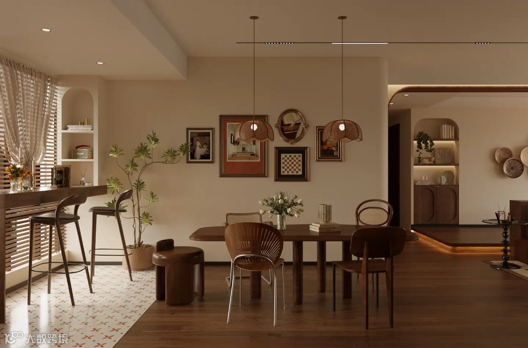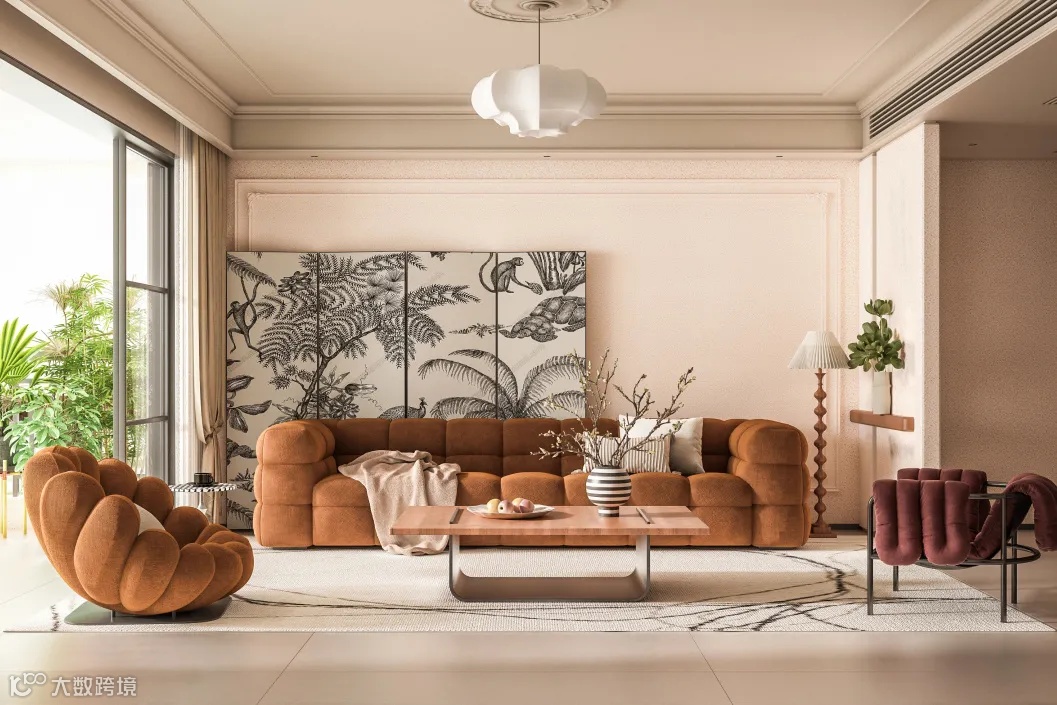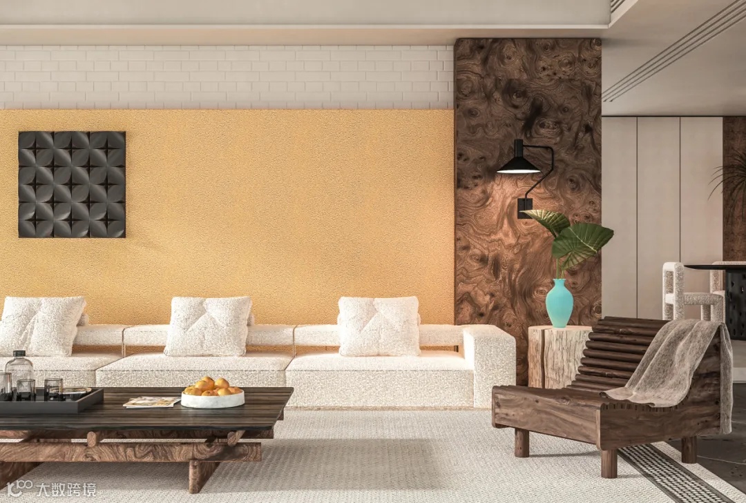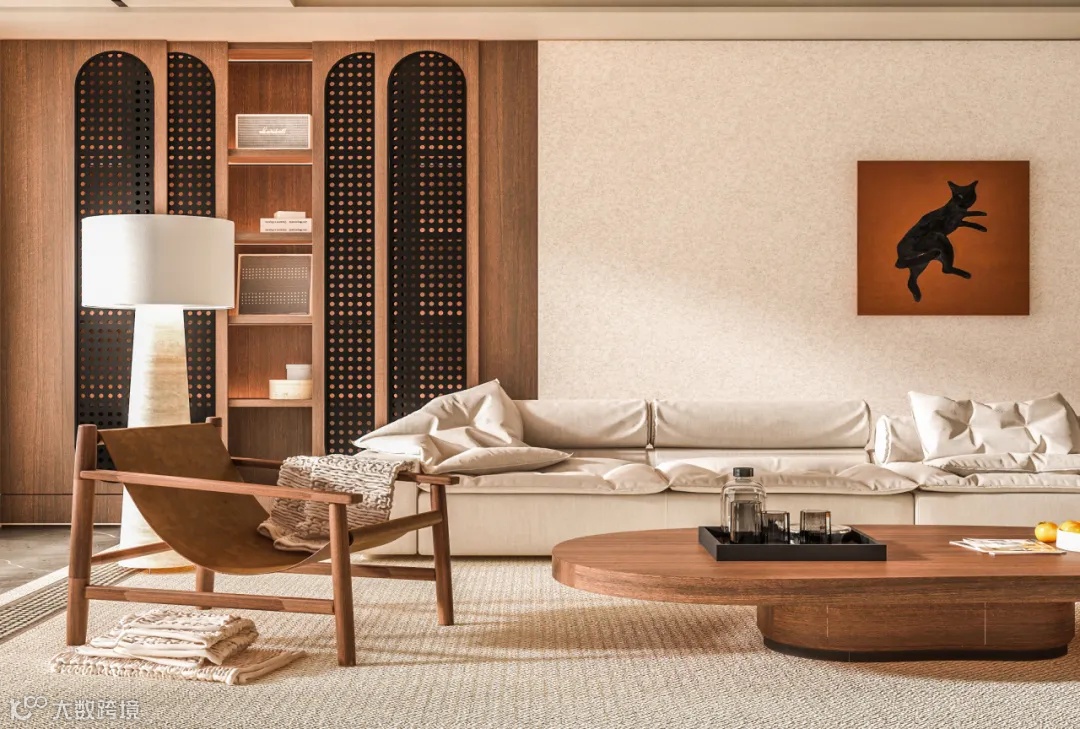 将该思维运用于家居搭配中——提取诸如卡其、深浅棕、褐色等代表色作为主基调,在细节处加上亮色系的橘色、红色等点缀,形成独有的美拉德秋日氛围,透露丝丝暖意。