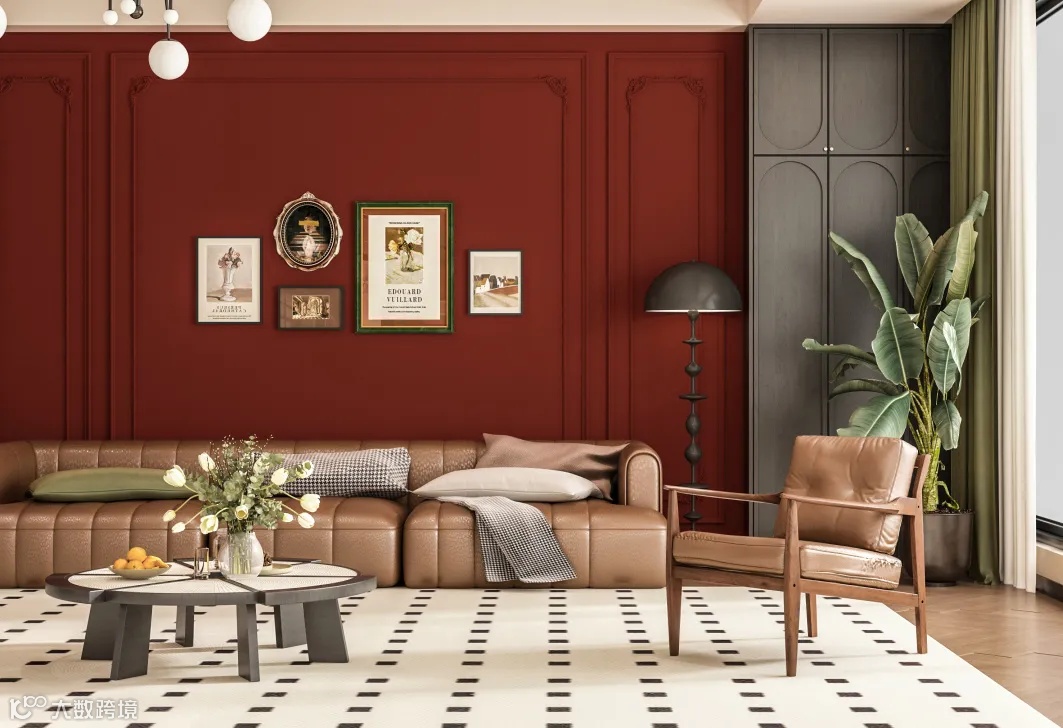 经典复古的配色,栗子棕色、红色、黑色晕染了浓郁的秋日氛围,珀特彩片的墙面效果,在自然光线下带有微闪的效果,让空间显得更加舒适和亲切,给人带来温暖和放松的感觉。