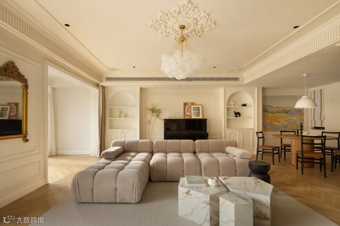 轻法式风格多数会摒弃传统法式的繁复、冗杂的装饰造型和甜腻的色泽,转而用经典轴线、对称布局的方式。多为开放式客餐厅,扩大空间的交互感,视觉纵深感。