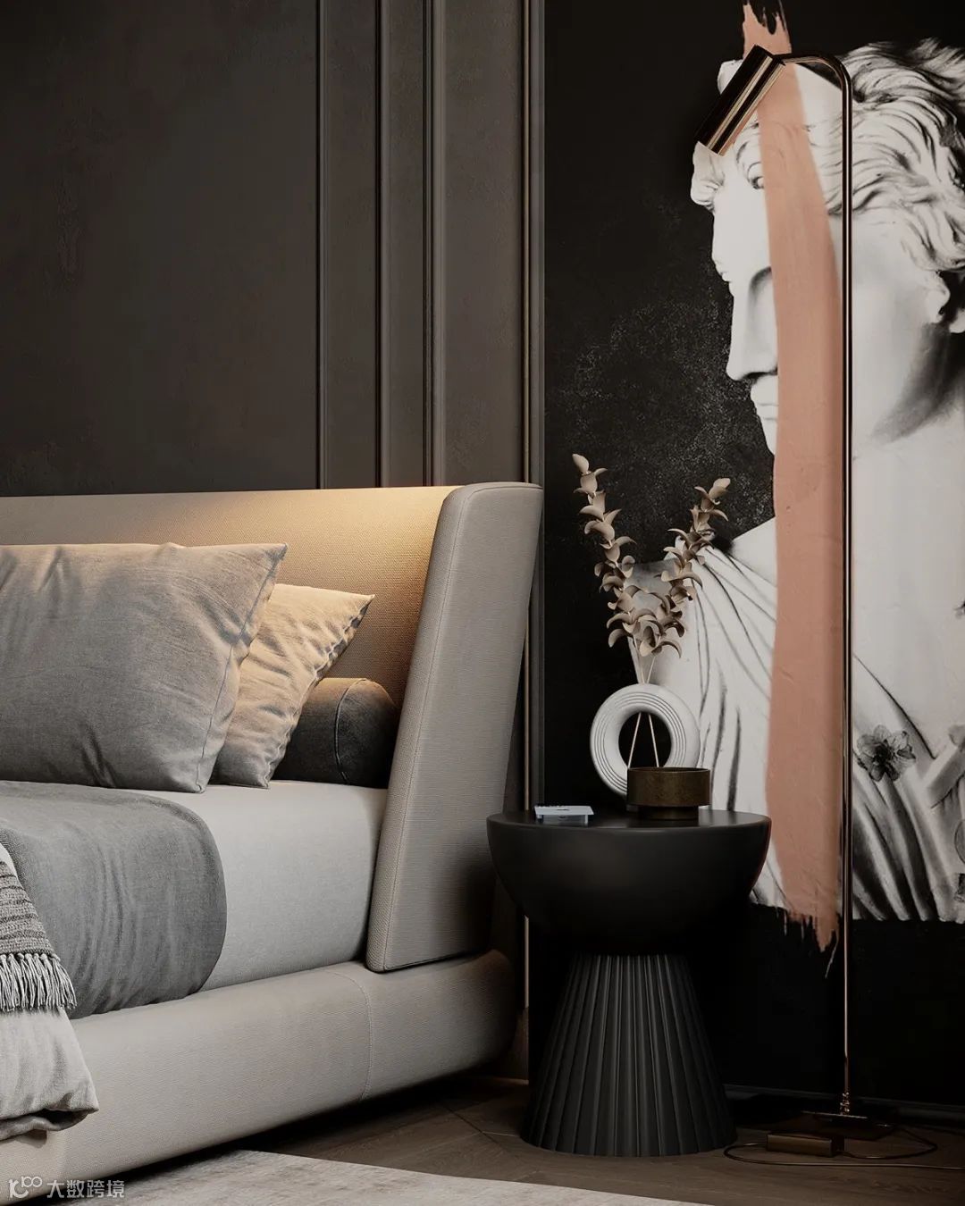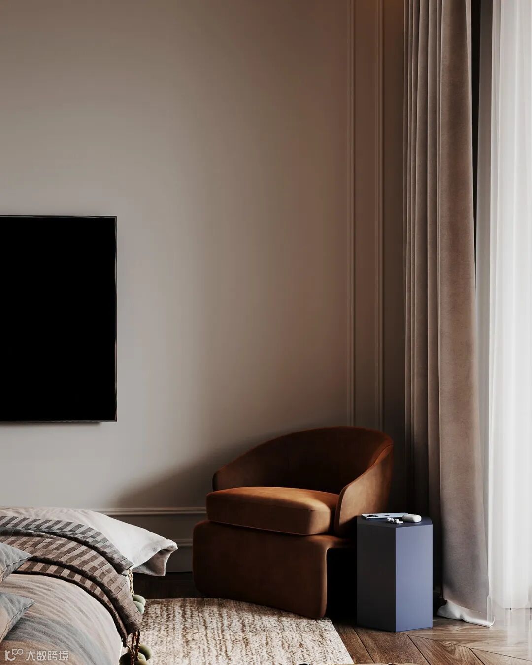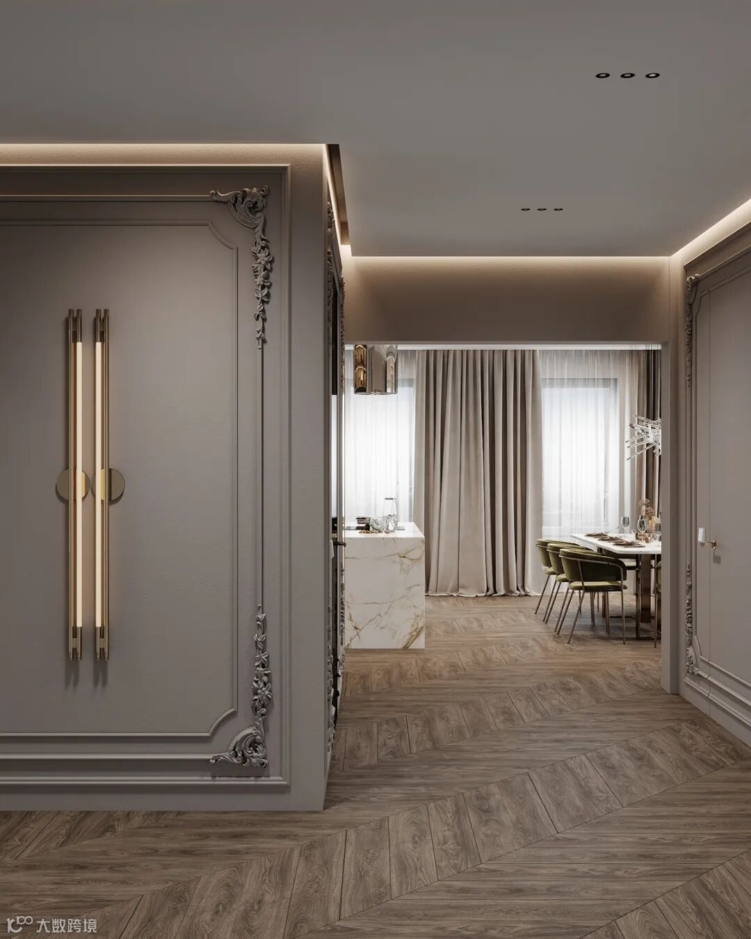 这套现代法式简约住宅,设计师以深色为主色调,通过选用多种材质进行创意设计,全屋背景墙主要以简约的线条造型让空白的墙面更有设计感和立体感,加上华丽的灯饰和隐藏的氛围灯带,空间呈现出简约又富丽的视觉交织美感,让人心动。