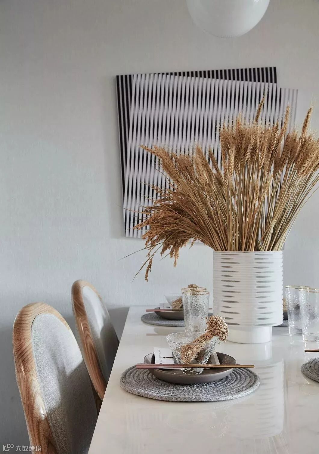 餐厅里白色大理石餐桌靠墙摆放,结合棕色皮质餐椅,放上屋主精心挑选的装饰物以及餐具,一幅简单的黑白装饰画很有层次感,打造出时尚又精致的用餐氛围。
