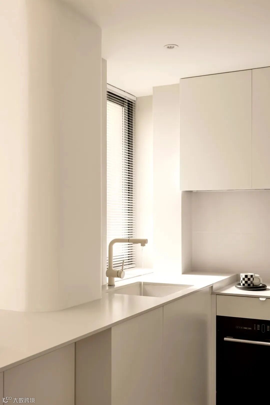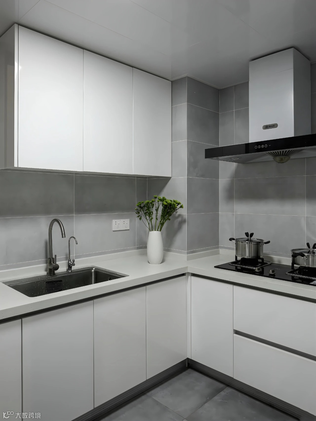 以白色为主的厨房设计,墙地砖和柜子、吊顶都是白色系的,可以搭配灰色的台面和踢脚线,让厨房显得不会那么单调。