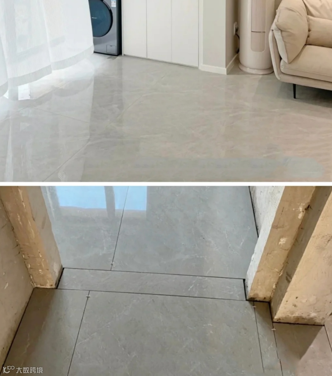其实瓷砖/地板通铺更显宽敞大气,也更适合大多数家庭,只不过会费时费料(注意避免工人做瓷砖同款门槛石)。