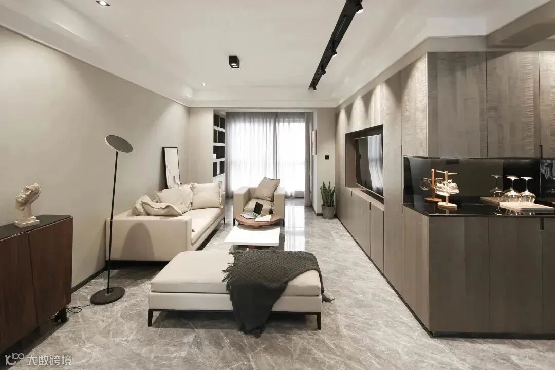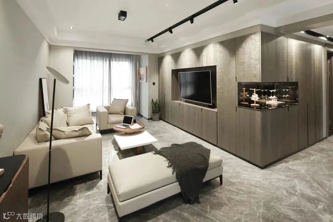客厅在天花四周做了一圈简洁大方的吊顶,无主灯的筒灯+导轨灯组合,在现代风的空间下,呈现出一种舒适优雅的空间氛围。整体地面以灰色大理石材质的地砖,布置米白色的皮沙发,定制柜作为电视墙的设计,带来的效果是自然舒适而大气。