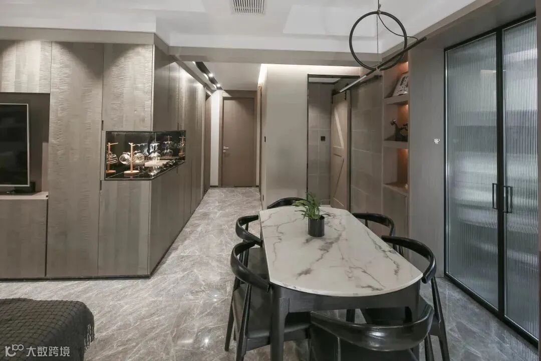 餐厅区域的侧边墙面还加入了壁龛,布置展示品提升空间的华丽感。中间黑色的餐桌以白色大理石为台面,搭配上深色皮艺坐垫的餐椅,也营造出一个端庄优雅的用餐空间。