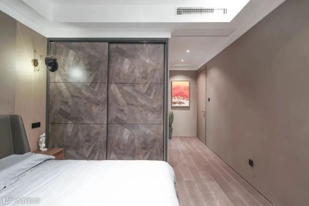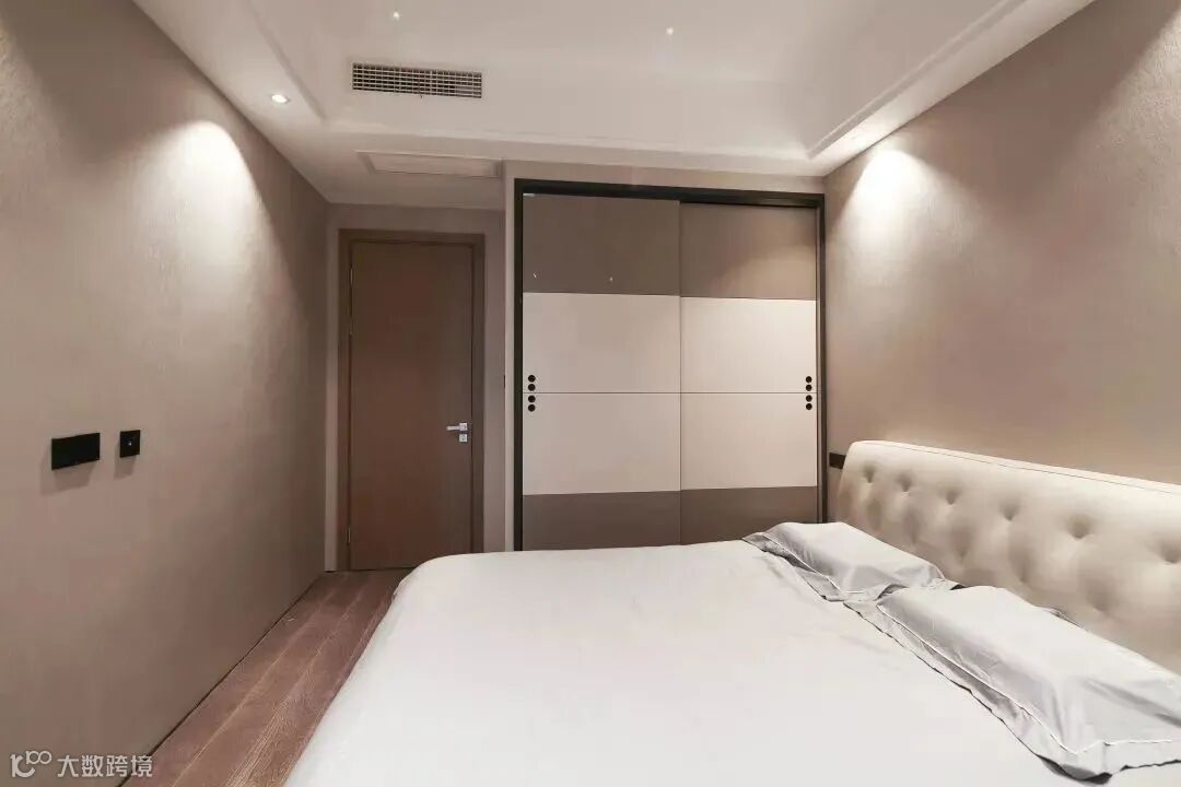 ▲次卧也是咖灰色的墙面空间,布置上一张米白色的皮艺床与白色素雅的床单,衣柜是双拼色的推拉门柜体设计,整体空间舒适温馨而实用大方。