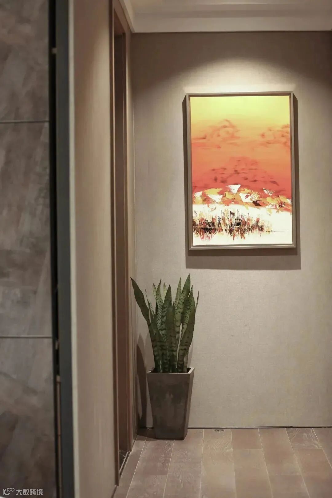 卧室门后的墙面上挂着一幅夕阳色的挂画,下方一盆虎皮兰,也点缀出一种情趣舒适的温馨感。