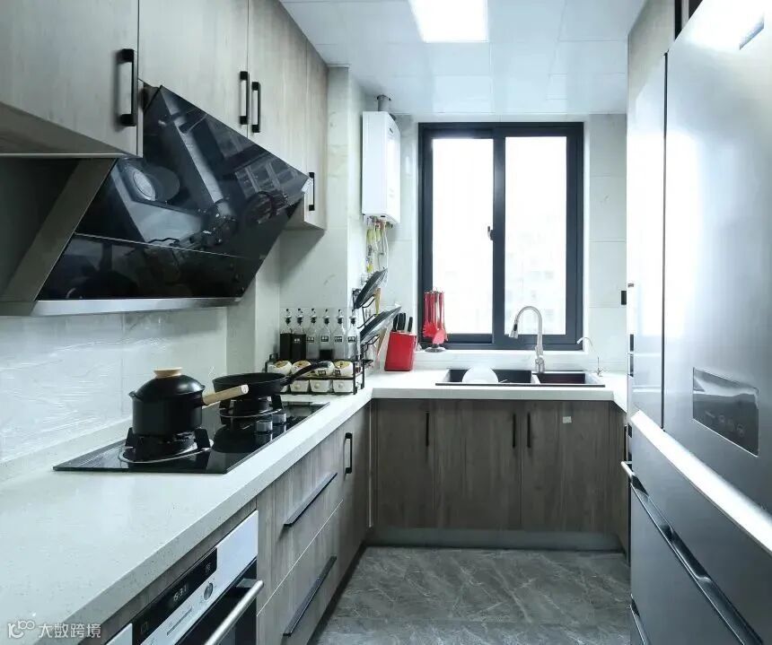 ▲厨房空间大小刚好,布置U字形操作台,对开门的大冰箱,定制木色的橱柜,让做饭空间显得更加实用而简约大方。