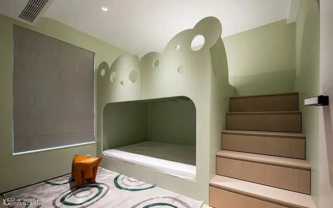 儿童房的设计则一改简约风格,采用清新的豆绿色作为房间的主色调,山下床的设计让小朋友玩耍活动的面积更大,童趣可爱的床板造型将上方空间打造成安全的私人乐园,给小朋友一个快乐玩耍成长的小天地。