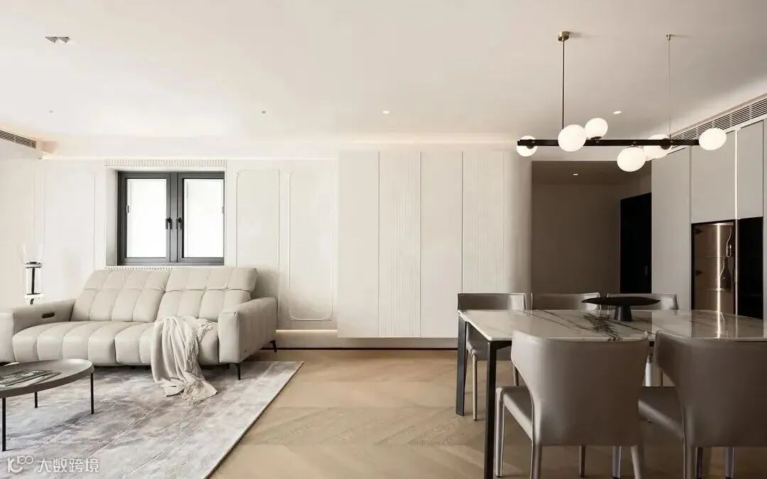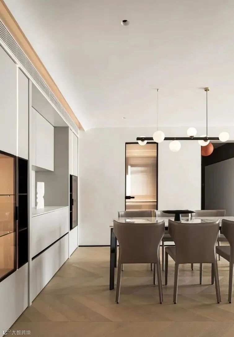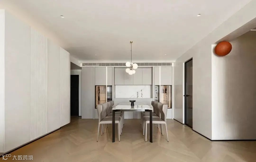 餐边柜上方同样安装空调管道,不额外占据层高空间。餐桌选择轻便的大理石台面与高挑细脚款式,不遮挡太多视野,让空间更显通透。