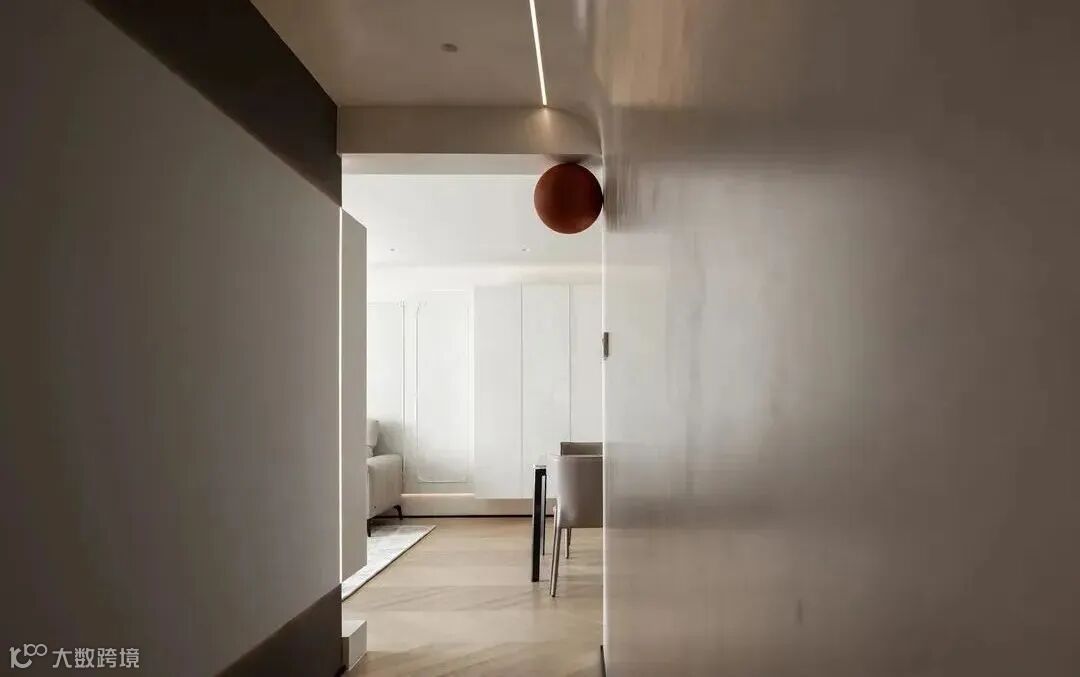 户型自带玄关,入户走廊较狭长,墙壁和吊顶选择同色米白水泥漆,视觉上扩大视野,更显宽敞。靠墙打造悬空玄关柜,便于收纳常穿的鞋子,保持空间整洁,有藏有露的设计让收纳充足,也方便日常进出的各项需求。 与其他空间的衔接转角处用圆弧面过渡,视觉上更为圆融舒适,也避免拐角磕碰,实用与美观并存。