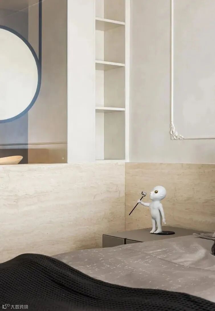 主卧的布局也延续简约的低饱和配色,空间以纯净大气为主,因为主卫靠近门边,入门便有一段走道,我们选择用玻璃半墙打造主卫,让空间更为通透,采光也更好。所以临近睡眠区的一侧,我们布置为干区,搭配悬挂的浴室圆镜,颇具有艺术美感。