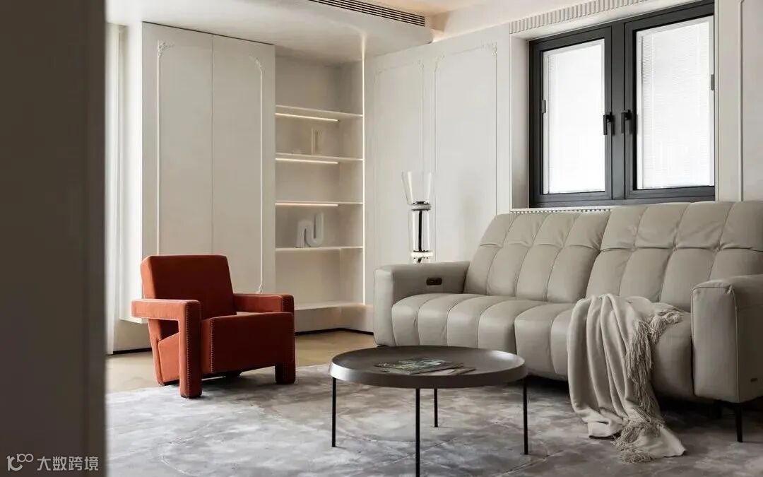 客厅与阳台之间打通,增加室内使用面积,转角靠墙打造收纳柜,素雅精致的雕花造型不显繁杂,却将每一处细节完美凸显出来,尽显气质,开放格横平竖直的灯线设计,让小小的收纳空间都变得更加别致。