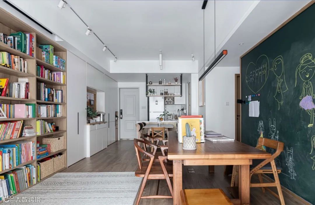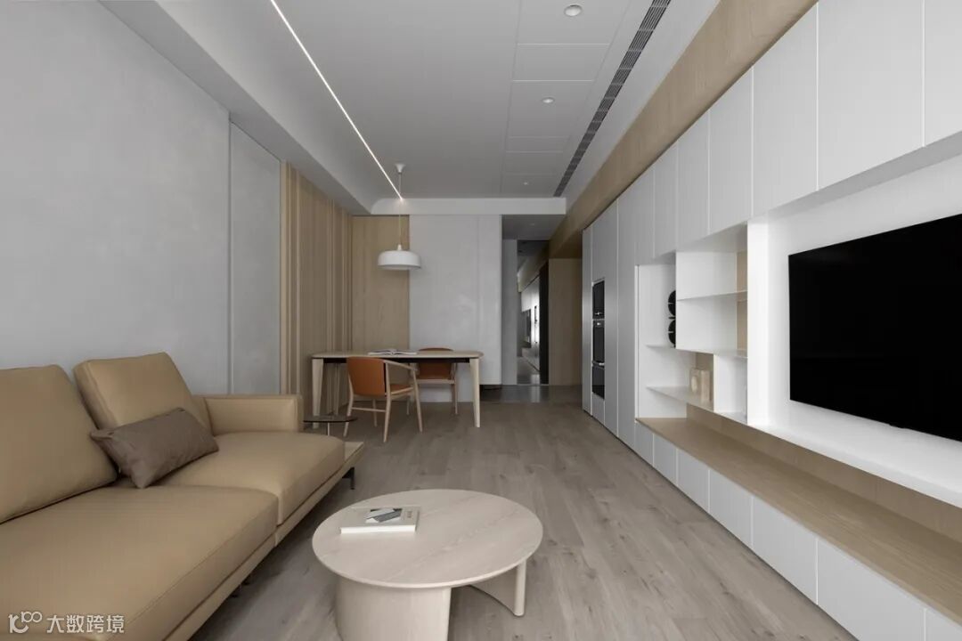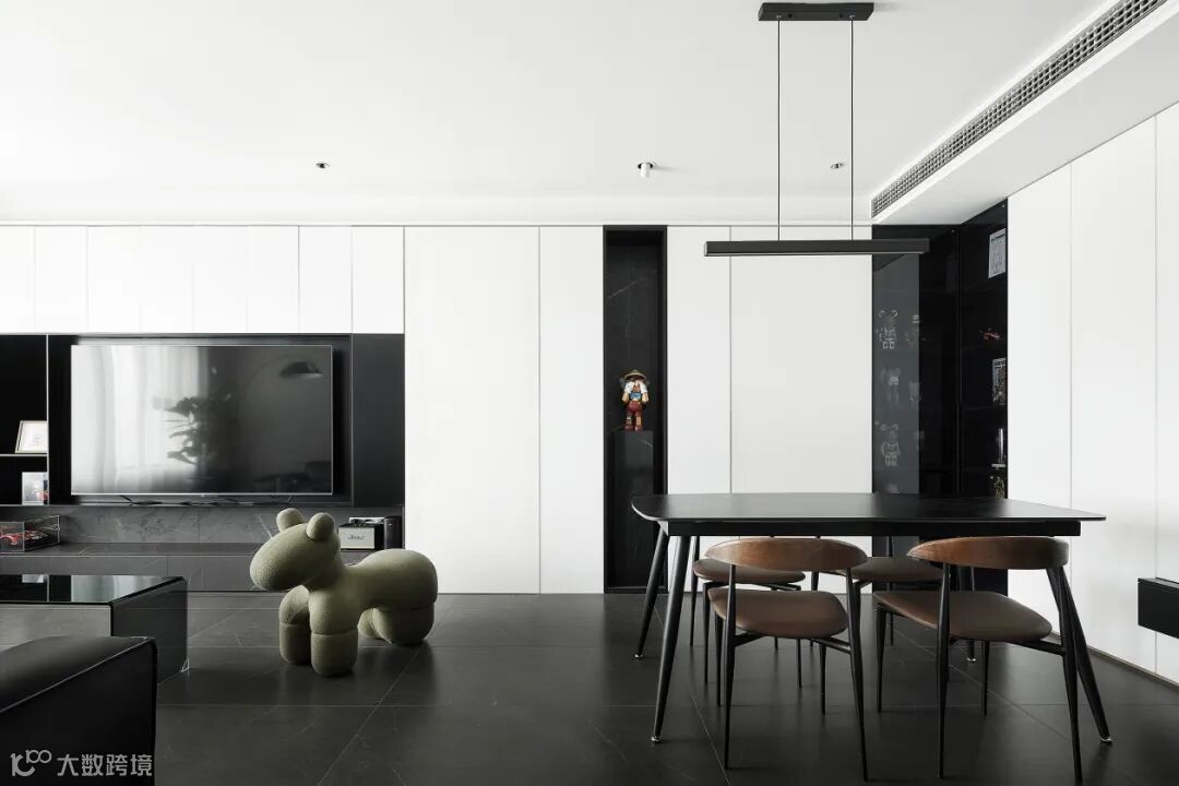在空间允许的情况下,设置定制柜体贯穿客餐厅,让墙面更有一体性,也给空间提供实用的收纳储物空间。