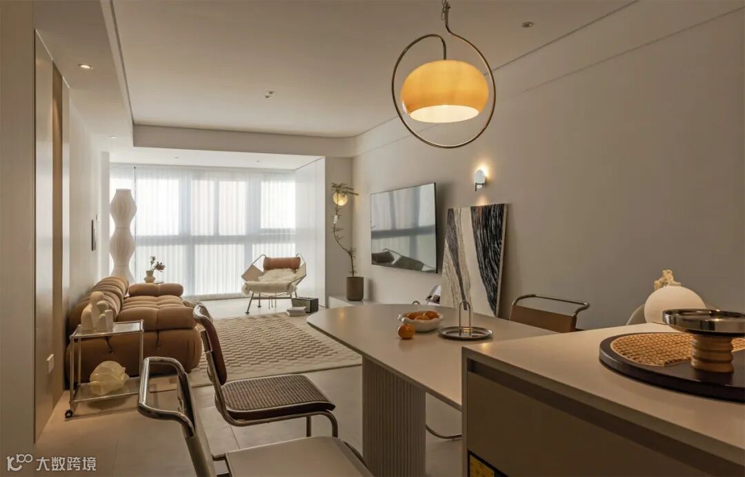 如果客餐厅空间并不大,我们可以直接把这个空间留空,提高空间的采光度,也方便两个空间之间的互动,使其动线更加宽敞流畅。