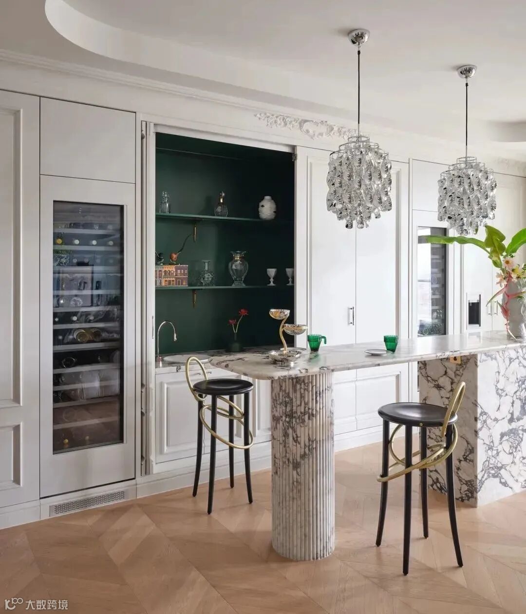 可以增加奢侈的感觉,注意的是,石材/岩板需要大面积出现,不能分割的太零碎,尽量是素色或者小花纹,这样才能奢华而不浮夸。
