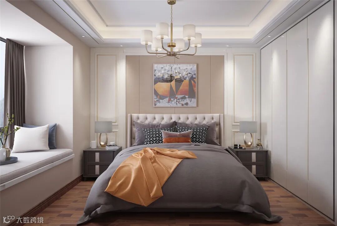 通过家具、布艺窗帘、毛毯、照明灯具等软装设计,展现出精美奢侈的感觉。