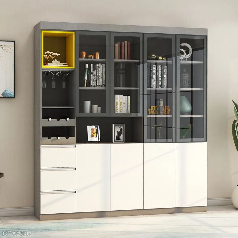 不妨在酒柜和置物柜中加几块深色玻璃,木纹与深色相撞,时尚又典雅,提高空间的视觉冲击感。