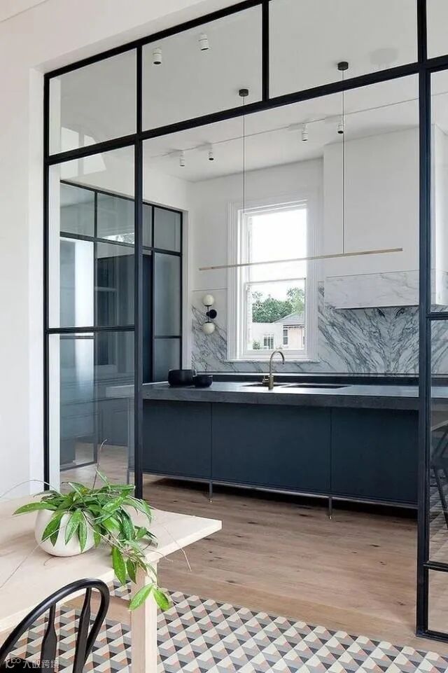 ①厨房门安装玻璃吊轨门,无地轨清洁更方便,开放式半开放式随意切换。