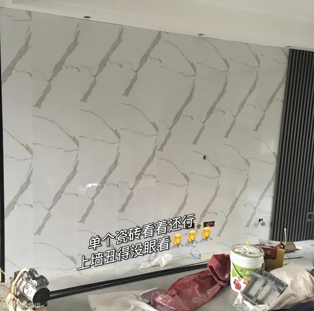 有花纹的瓷砖,本是为了模仿大理石的纹理,显得高级。但如果同版瓷砖贴出来方向一致、花纹死板,就会失去自然感,也就无法展现出大理石的高级感。