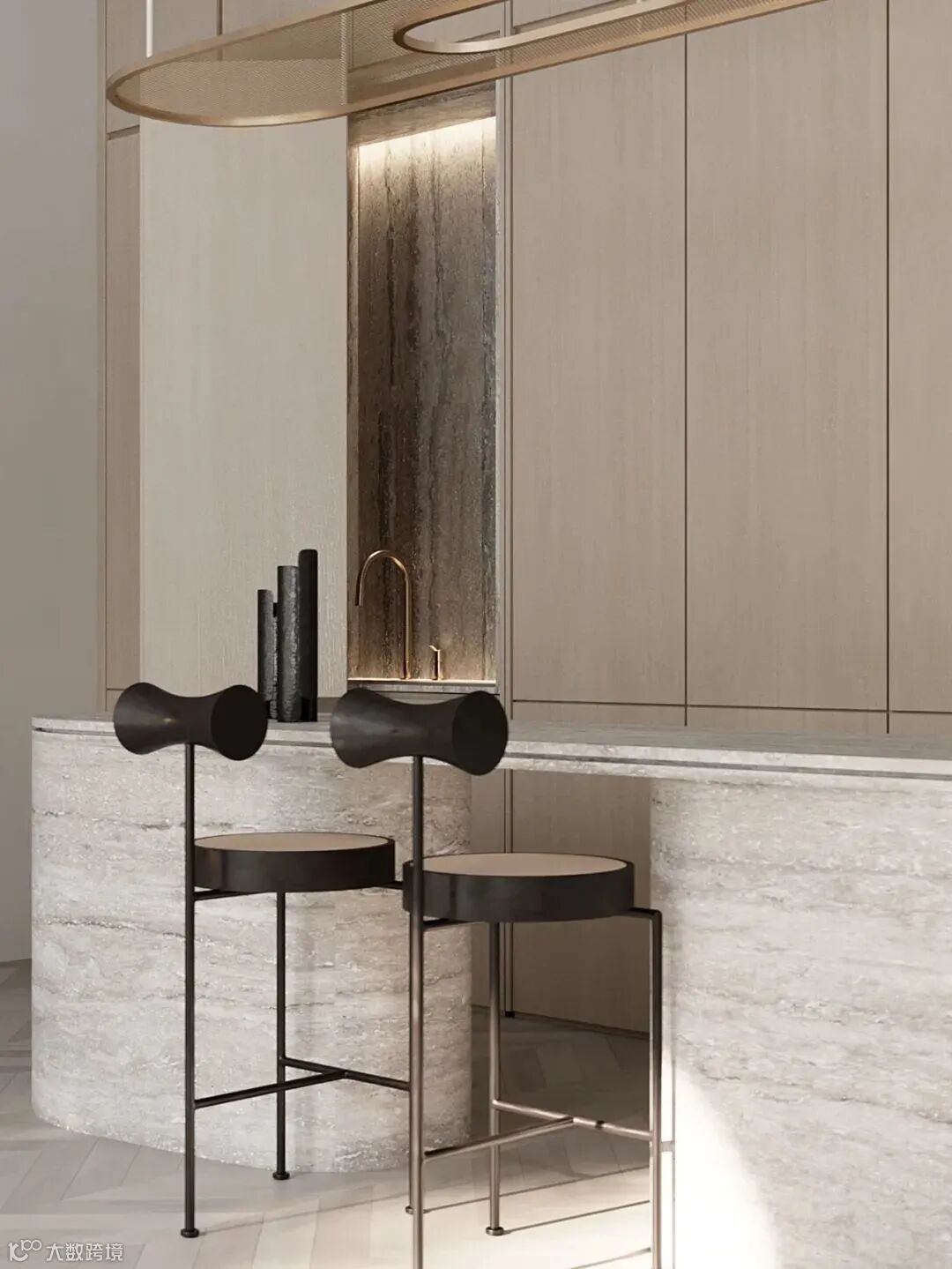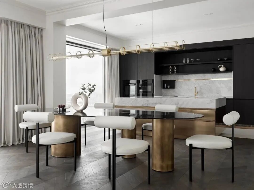 中间是一张定制的椭圆形餐桌,把客厅和厨房隔开,其中桌脚和岛台底部都采用黄铜元素,让空间的气质更加温暖。