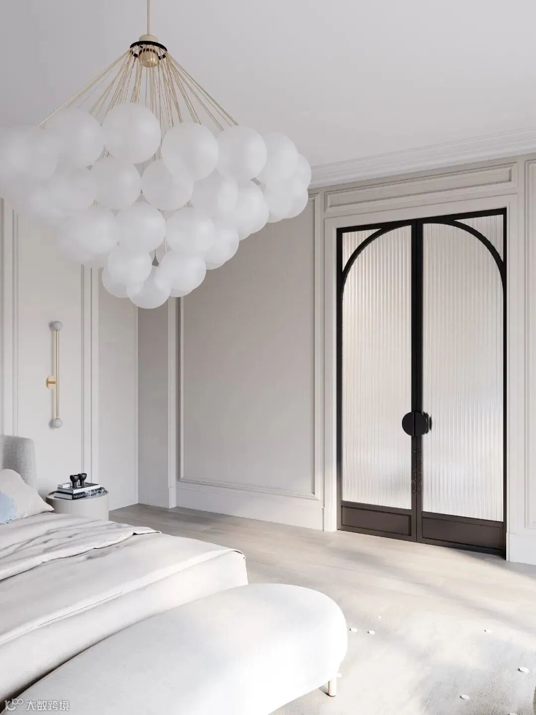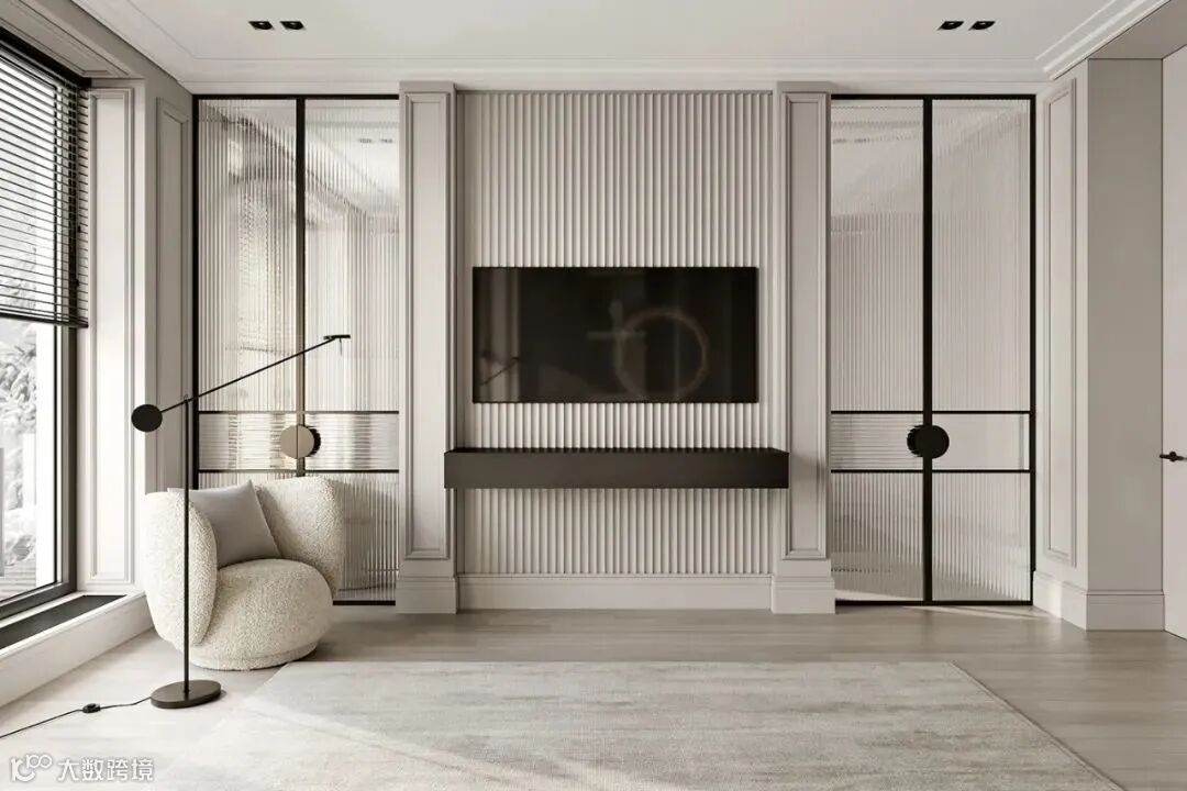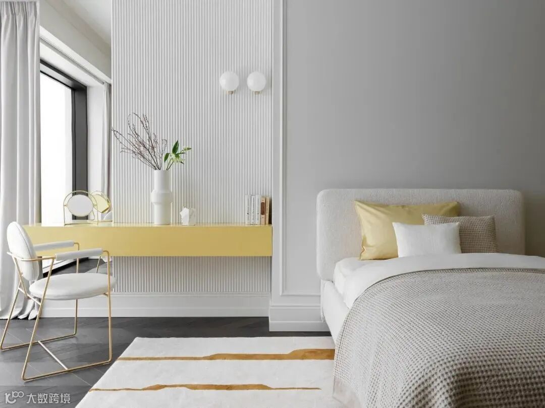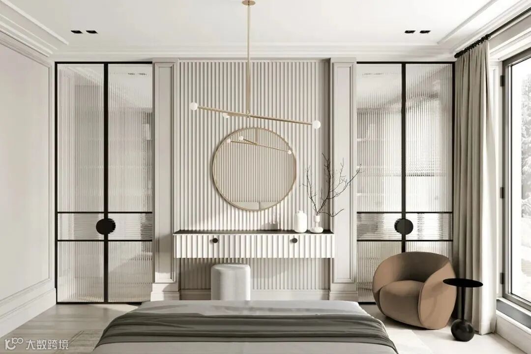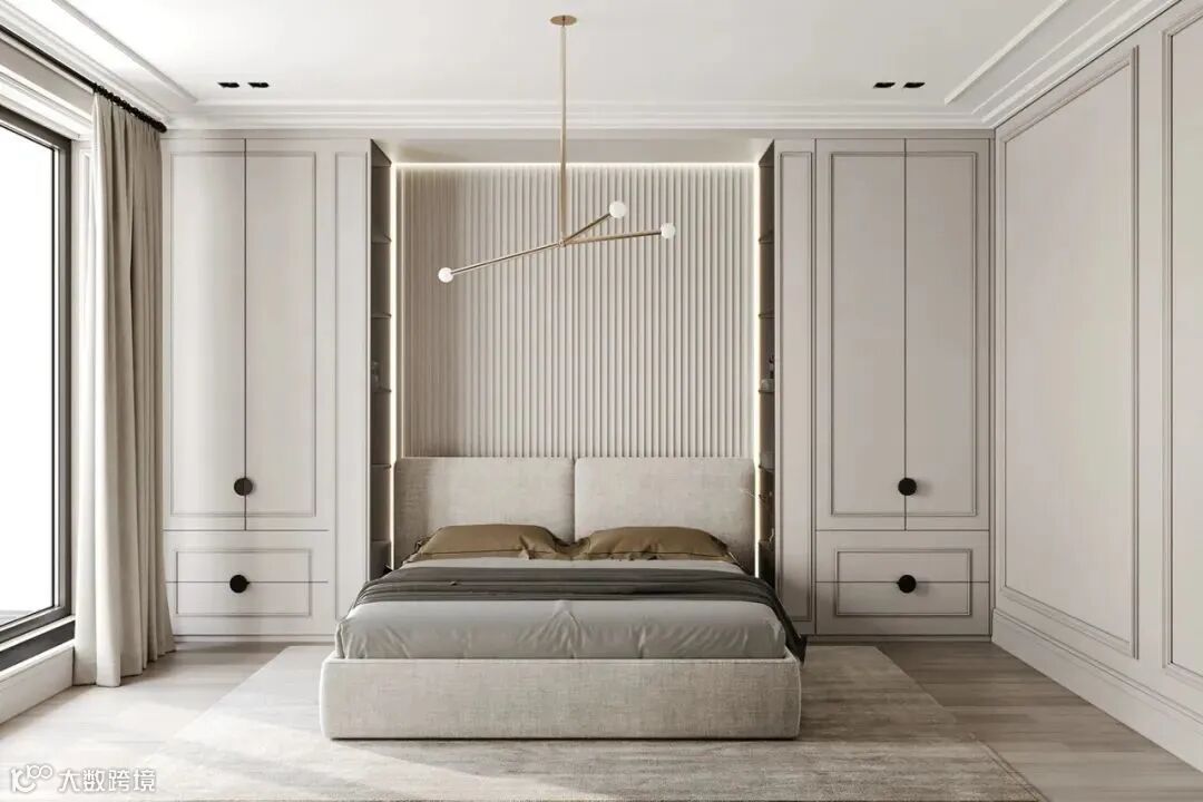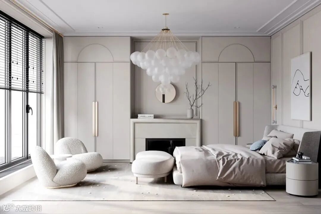 整体空间像是法式风格和轻奢风格的结合,材质采用相似质感或颜色的处理,使画面更加统一。