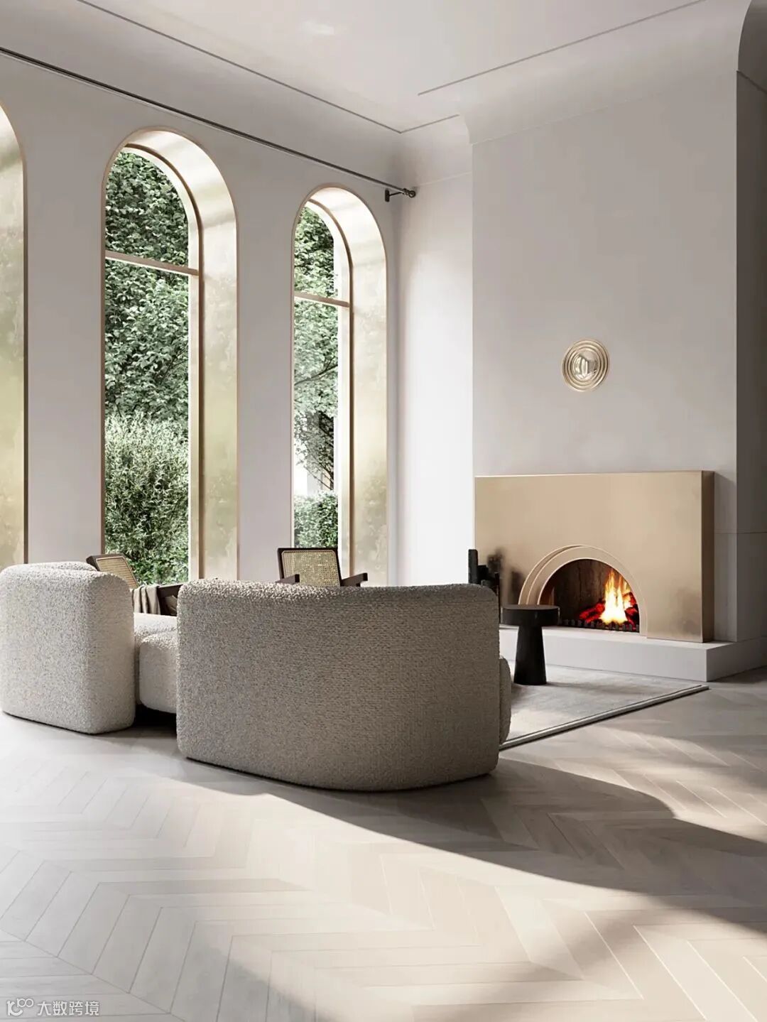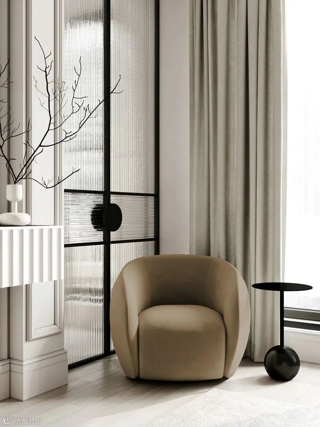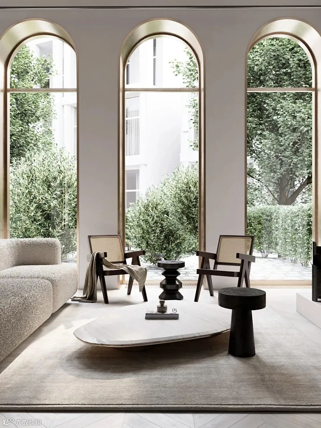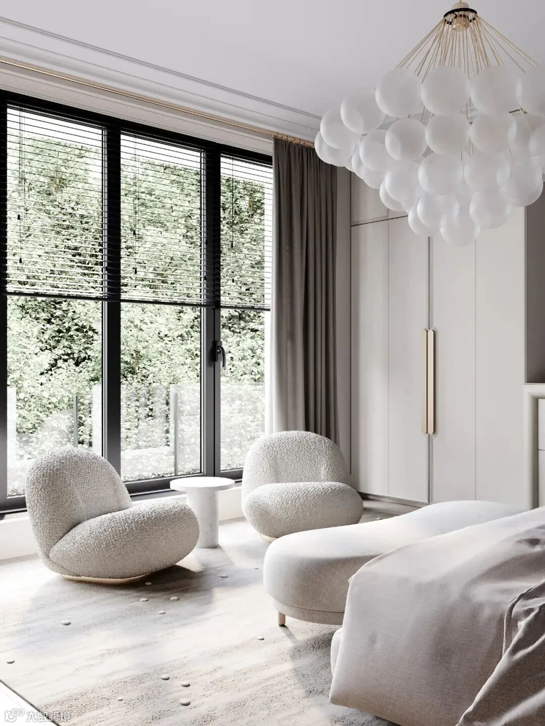 整体空间像是法式风格和轻奢风格的结合,材质采用相似质感或颜色的处理,使画面更加统一。