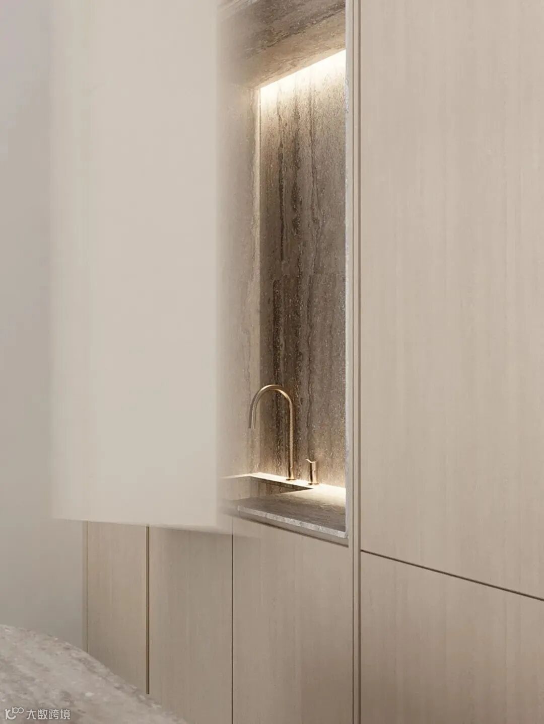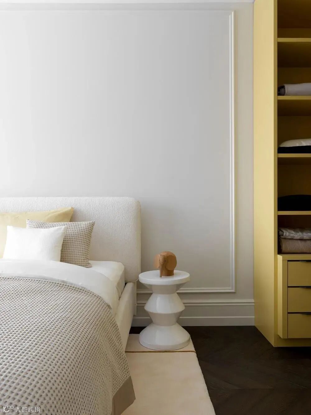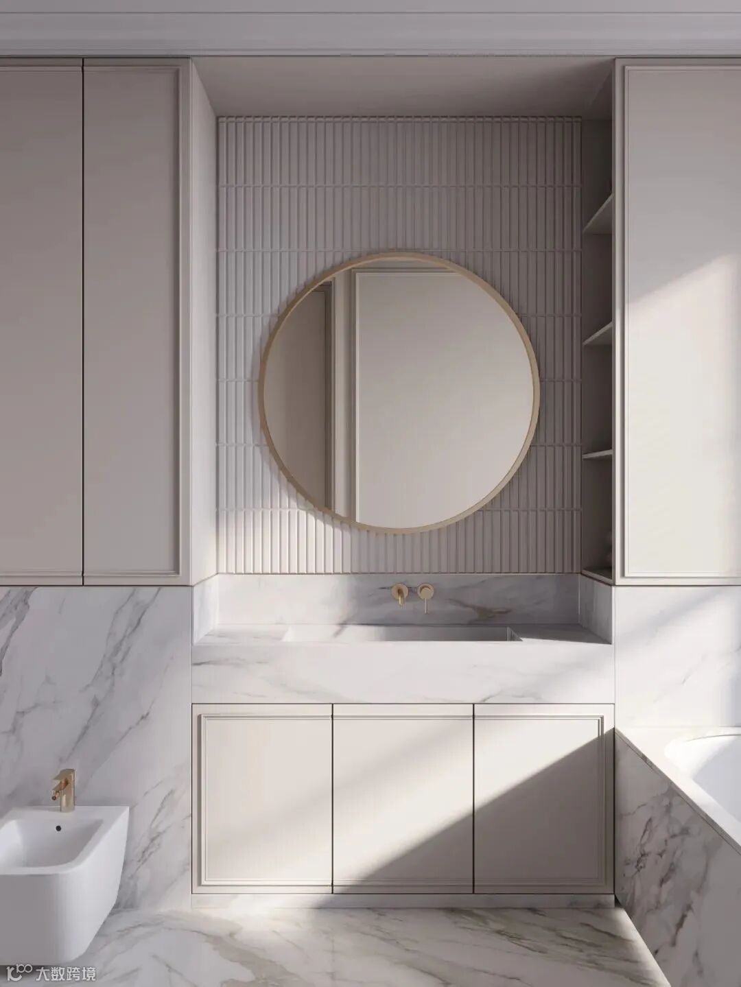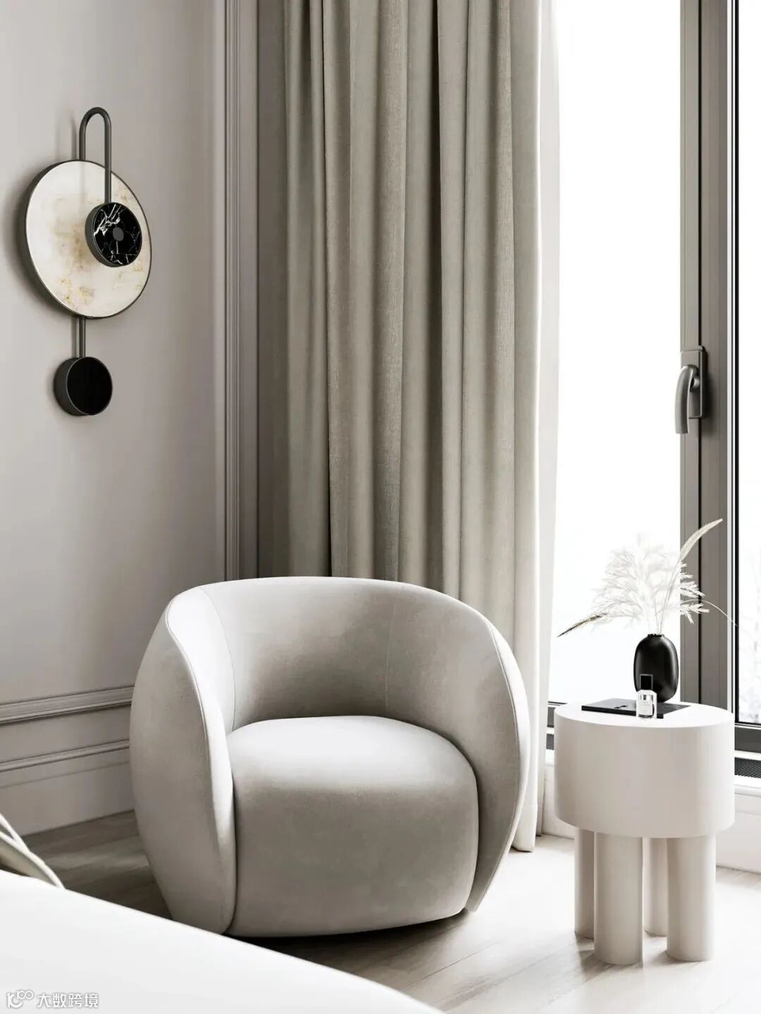整体空间像是法式风格和轻奢风格的结合,材质采用相似质感或颜色的处理,使画面更加统一。