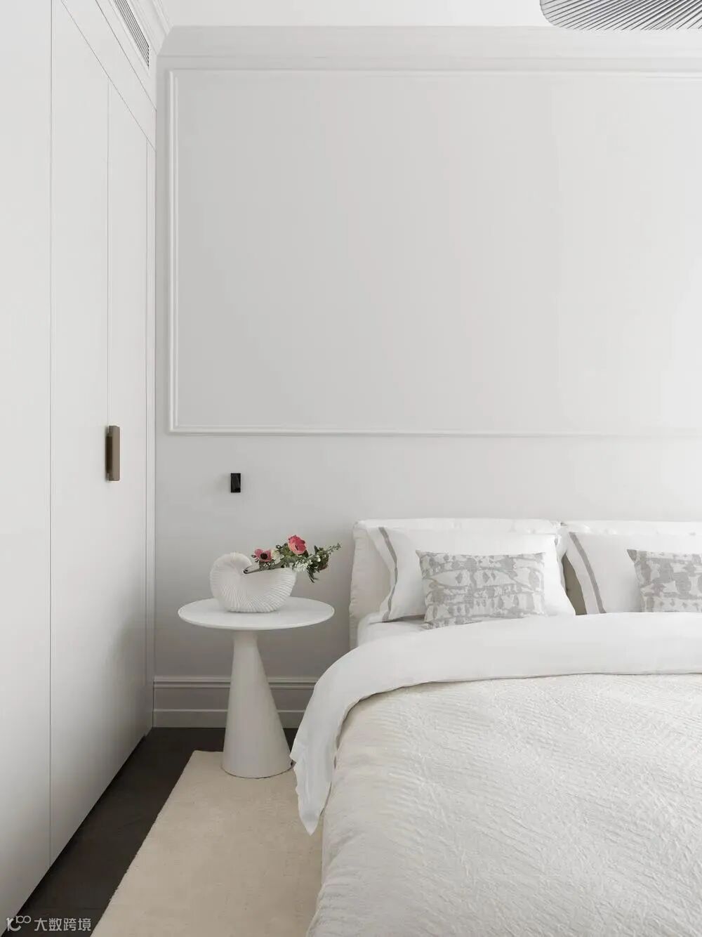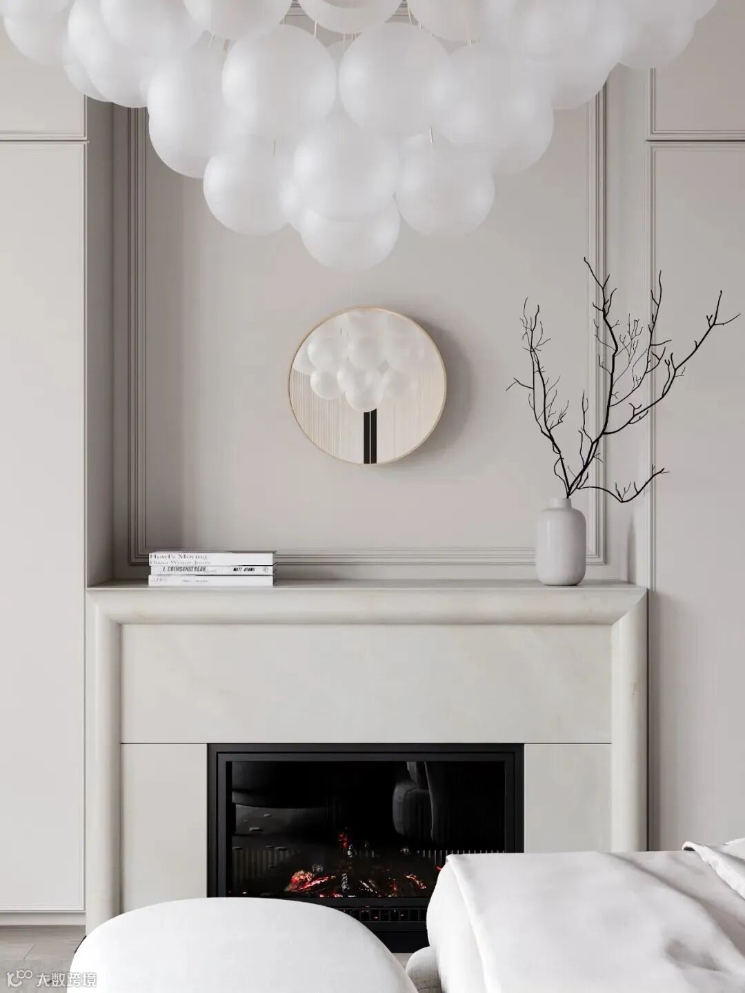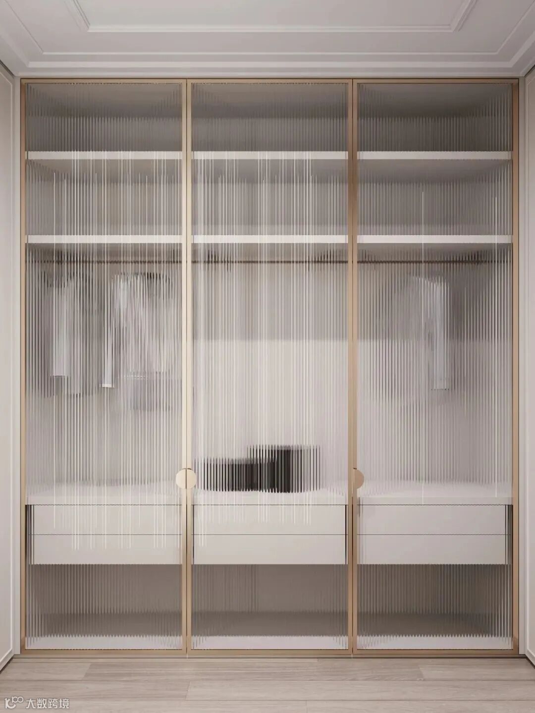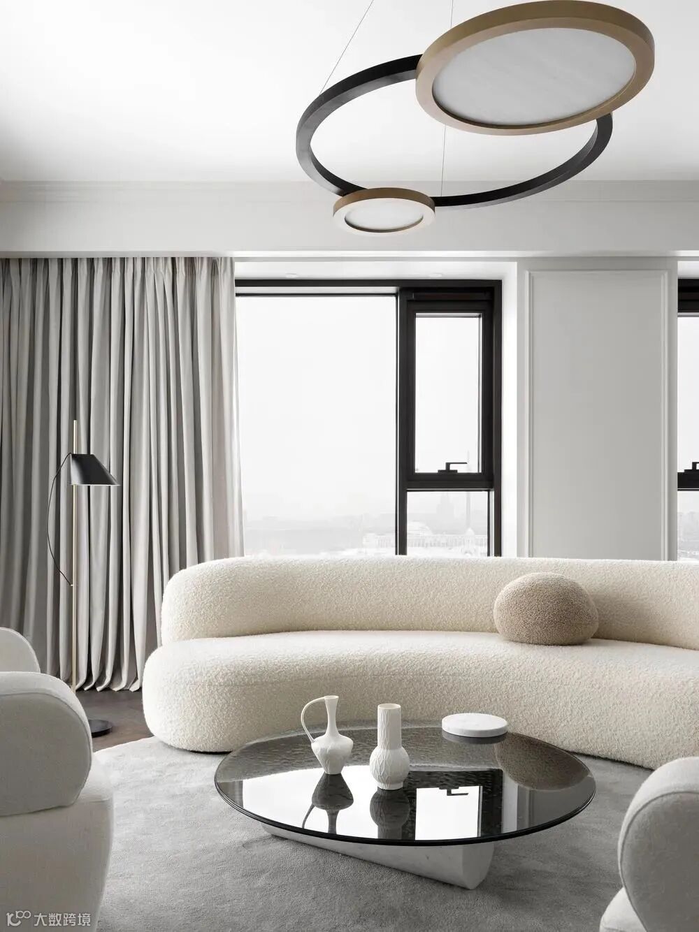 整体空间像是法式风格和轻奢风格的结合,材质采用相似质感或颜色的处理,使画面更加统一。