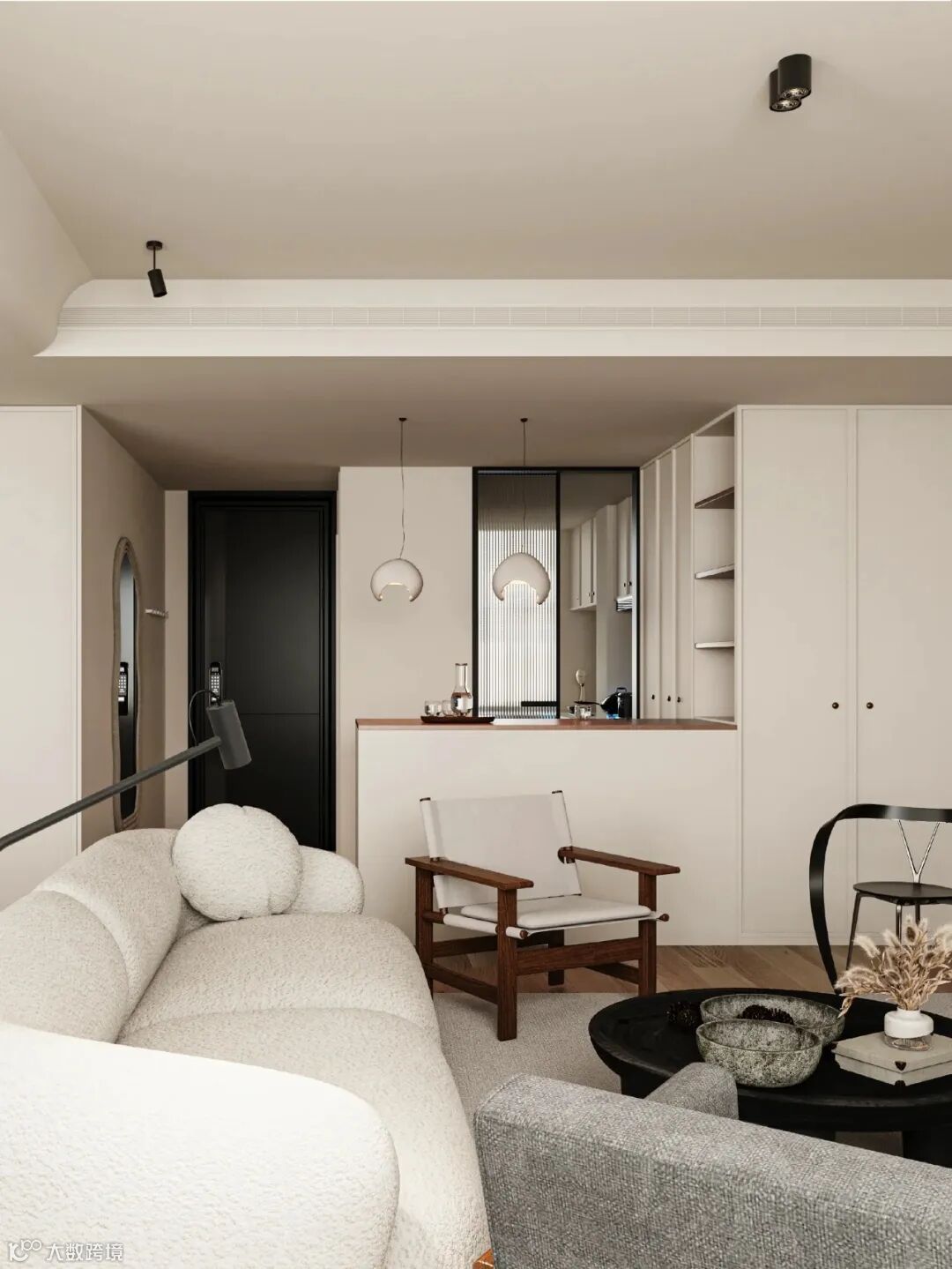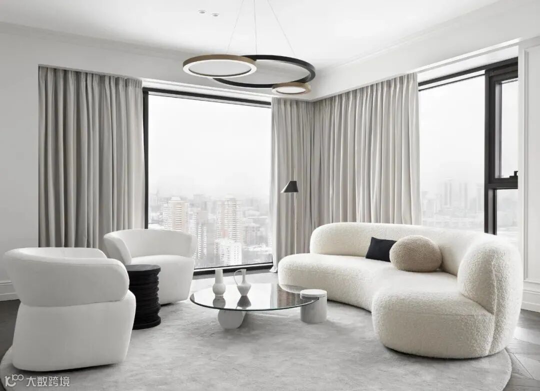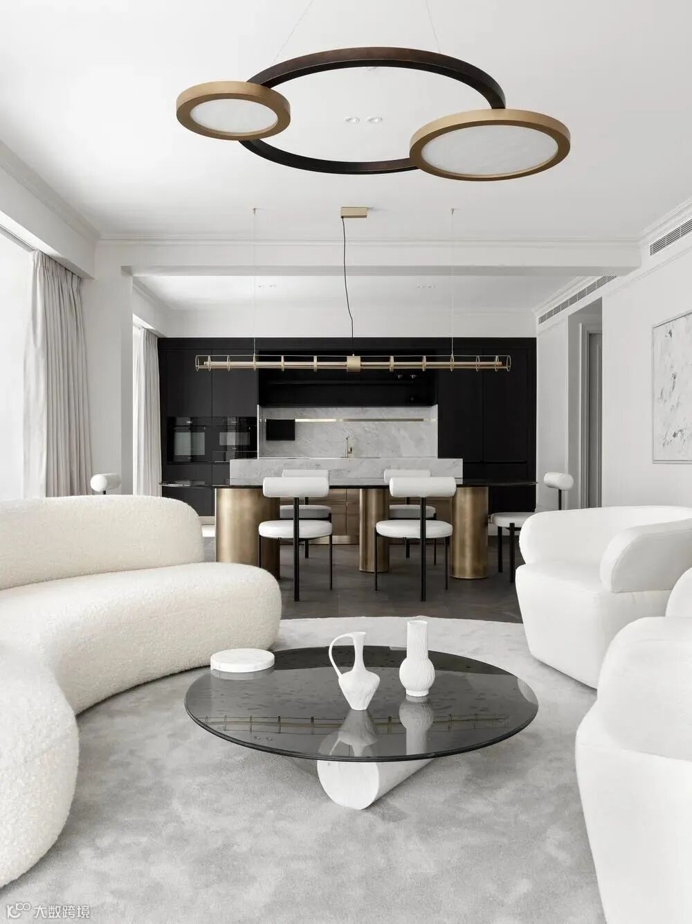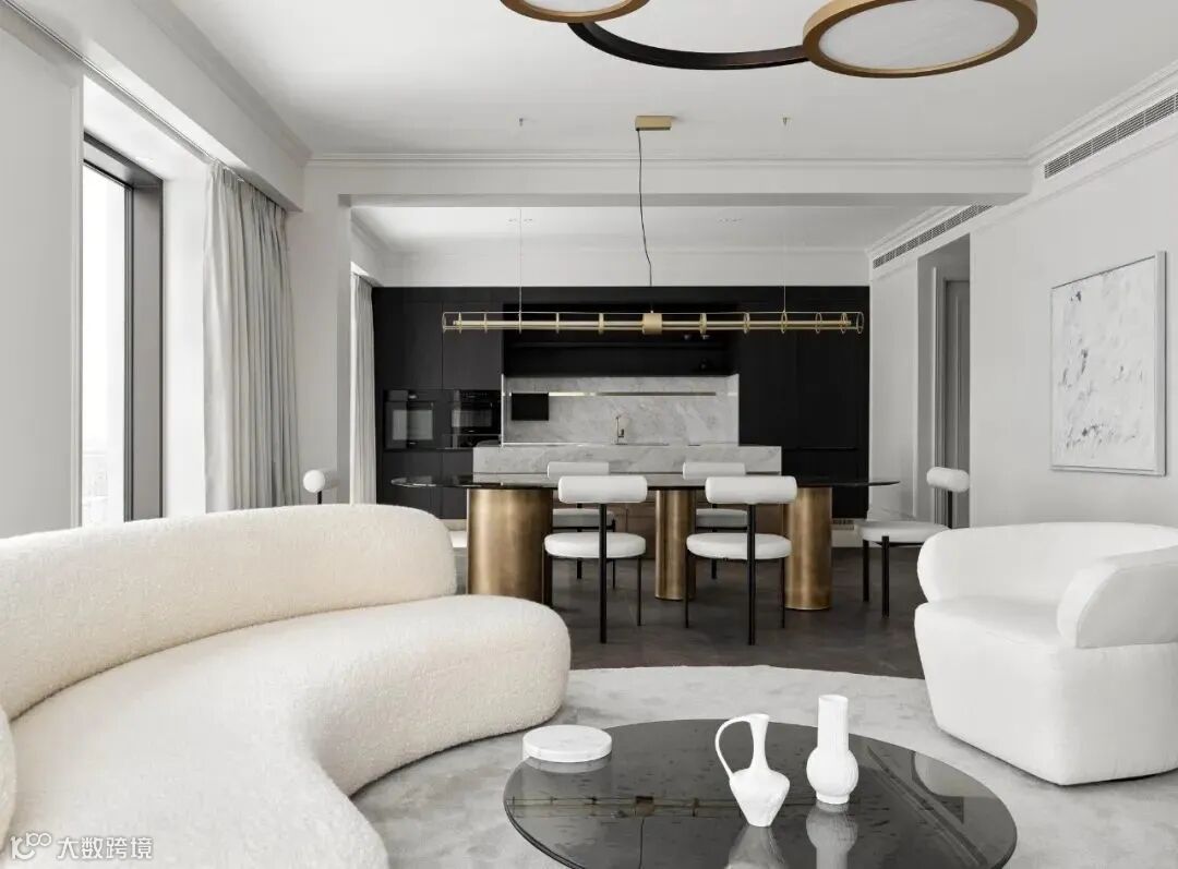 客厅厨房餐厅都在同一轴线上,客厅采用白色,厨房以黑色为主,形成鲜明对比。