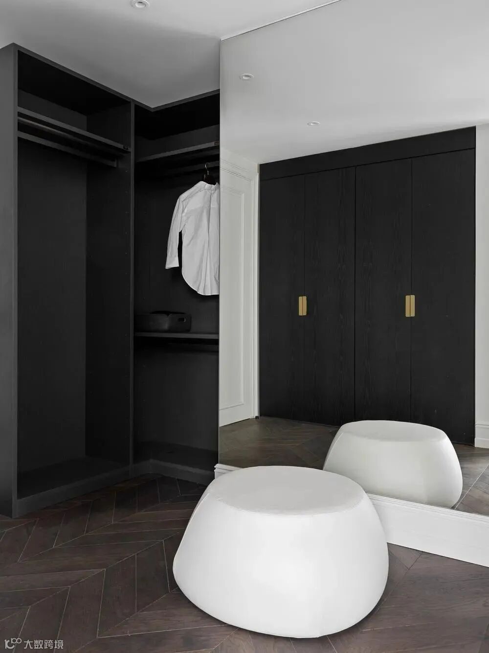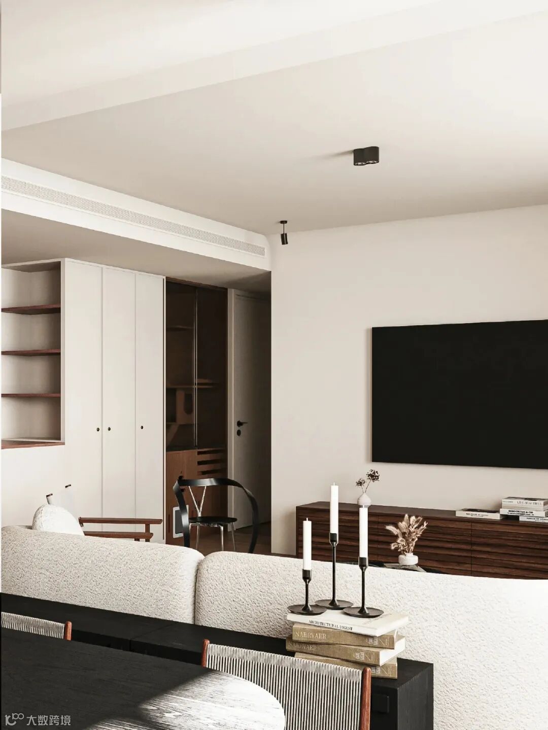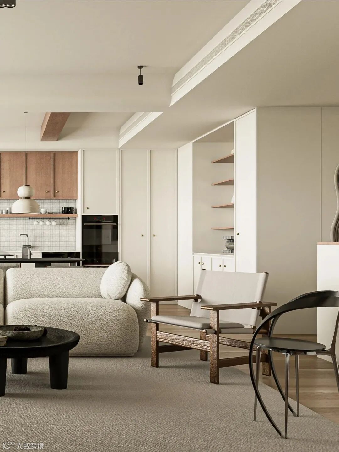 客厅厨房餐厅都在同一轴线上,客厅采用白色,厨房以黑色为主,形成鲜明对比。