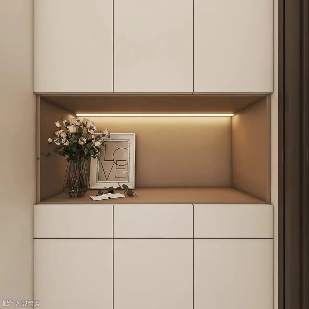 入户门厅做了通长通顶的整体定制柜,柜体简洁,不做把手设计,看上去整齐大方。整体柜中间做了开放格设计,摆放精致摆件,让进门看着更温馨。三个小抽屉可以放零散小物件,比如雨伞、鞋油等。就近收纳更加符合业主使用习惯,为生活提供更多便利。