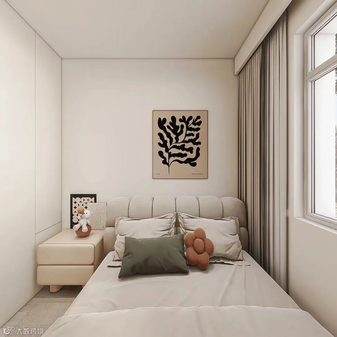 次卧的床为了实现采光最大化,也采用了靠墙摆放的方式。当然,也是为了利用另一边的墙体做通顶定制衣柜,丰富收纳。床头柜是双层抽屉设计,实用方便拿取物品,而且是高脚款,让卫生不留死角。