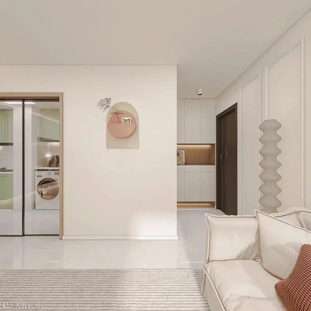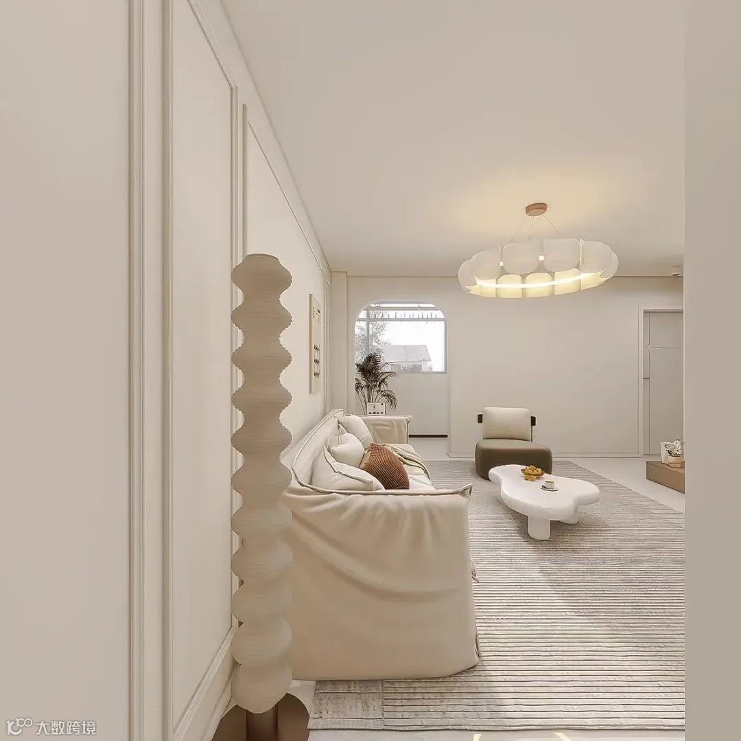 从入户一眼望到阳台,纵向视野开阔,显得家更大。白色整体风格也会显得空间立体,不做吊顶,而是用石膏线勾勒,不压层高。吊灯足够大,圆形云朵灯非常有温度,对应茶几选择了云朵异型款, 属于相辅相成。