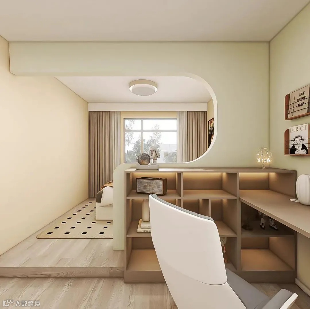 弧形隔断墙体通刷淡绿色乳胶漆,简洁清新富有朝气,且消除了长条户型的刻板。同时,有了墙壁的依托,做了半边开放式收纳柜,连接书桌,非常方便。