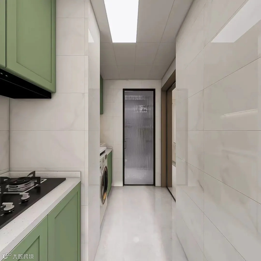 厨房长度足够,为了不浪费空间,在进门处做了洗衣区,不仅放下了洗衣机,还留出了收纳柜,放洗衣用品非常方便。厨房做了长虹玻璃门,让窗户的光线直达过来,更加通透。