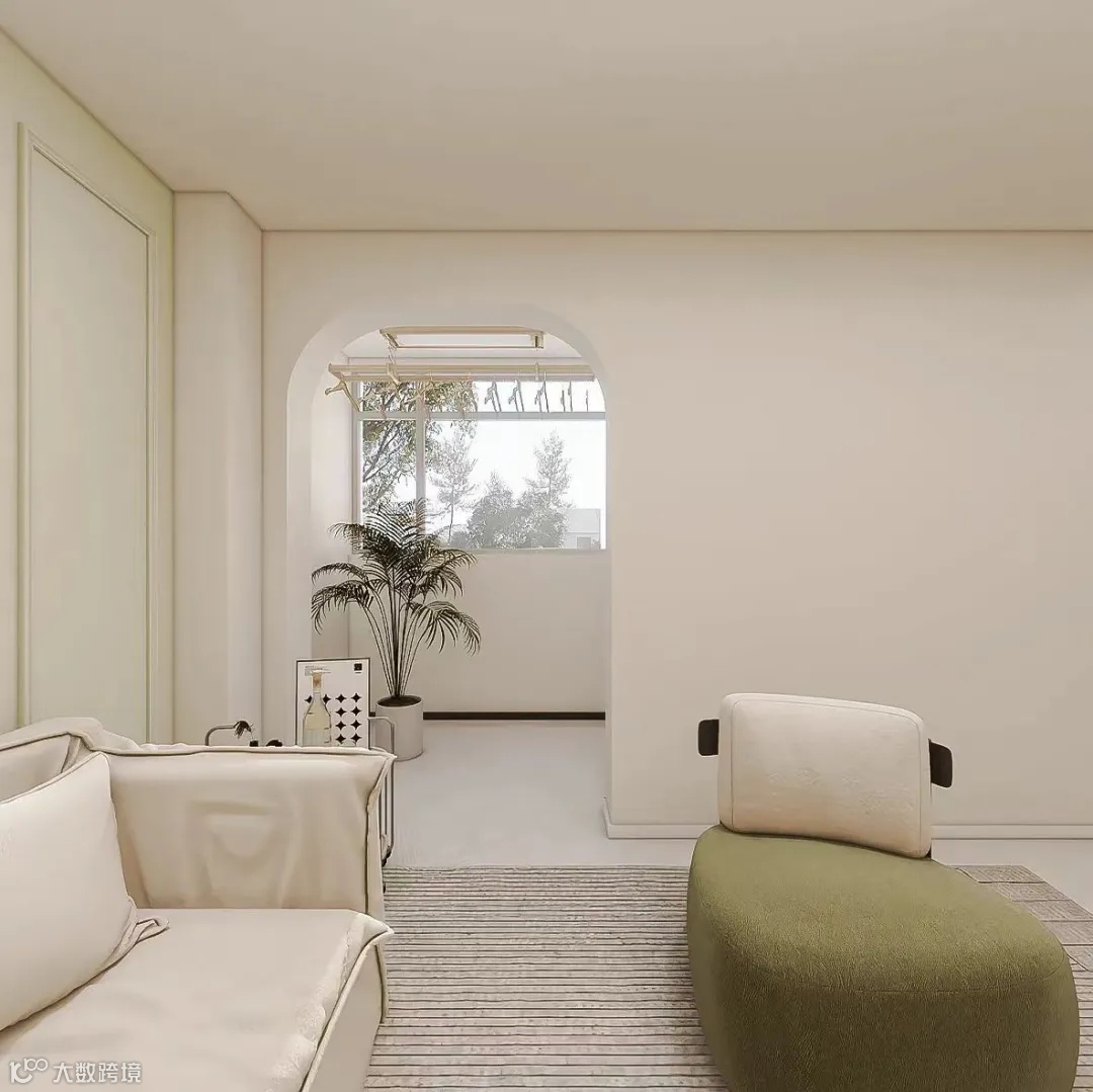 客厅连接阳台的门做了拱门,但是足够宽,方便来回穿梭。客厅沙发为米白落地款,外加绿色休闲沙发,会让客厅整体更简洁,但不单调,甚至绿色的加入会更有朝气。