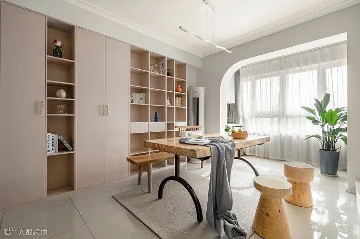 ●直接不要客厅,原地改开放式书房,同时能够满足会客、阅读、办公、用餐的功能