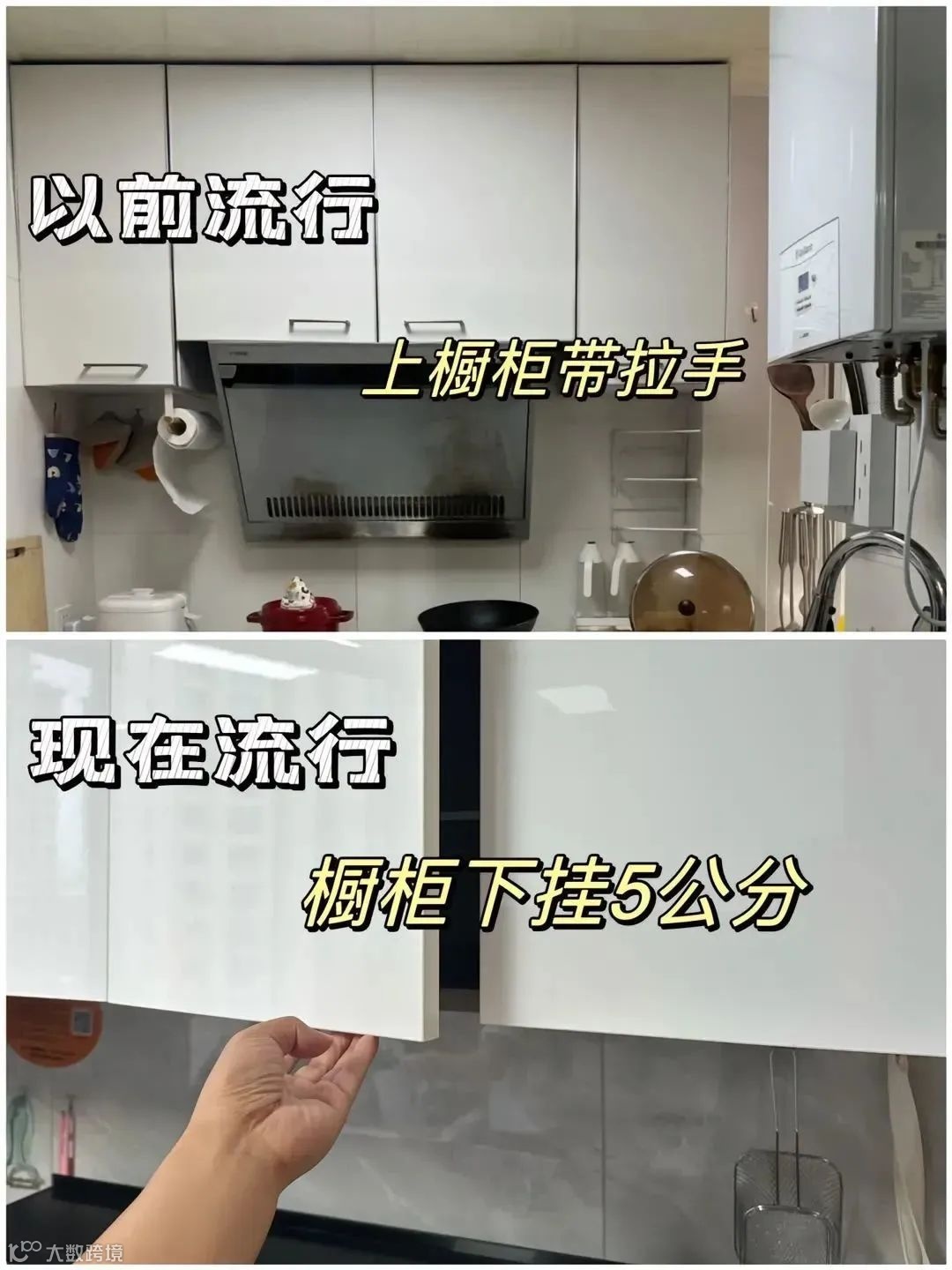 过去,上橱柜通常带有拉手,但现在的趋势是橱柜下挂5公分。这种设计不仅增加了厨房的现代感,还使清洁变得更加容易。橱柜下挂5公分可以让您轻松清扫地面,同时为厨房增加一些空气感,让您的烹饪空间更加舒适。