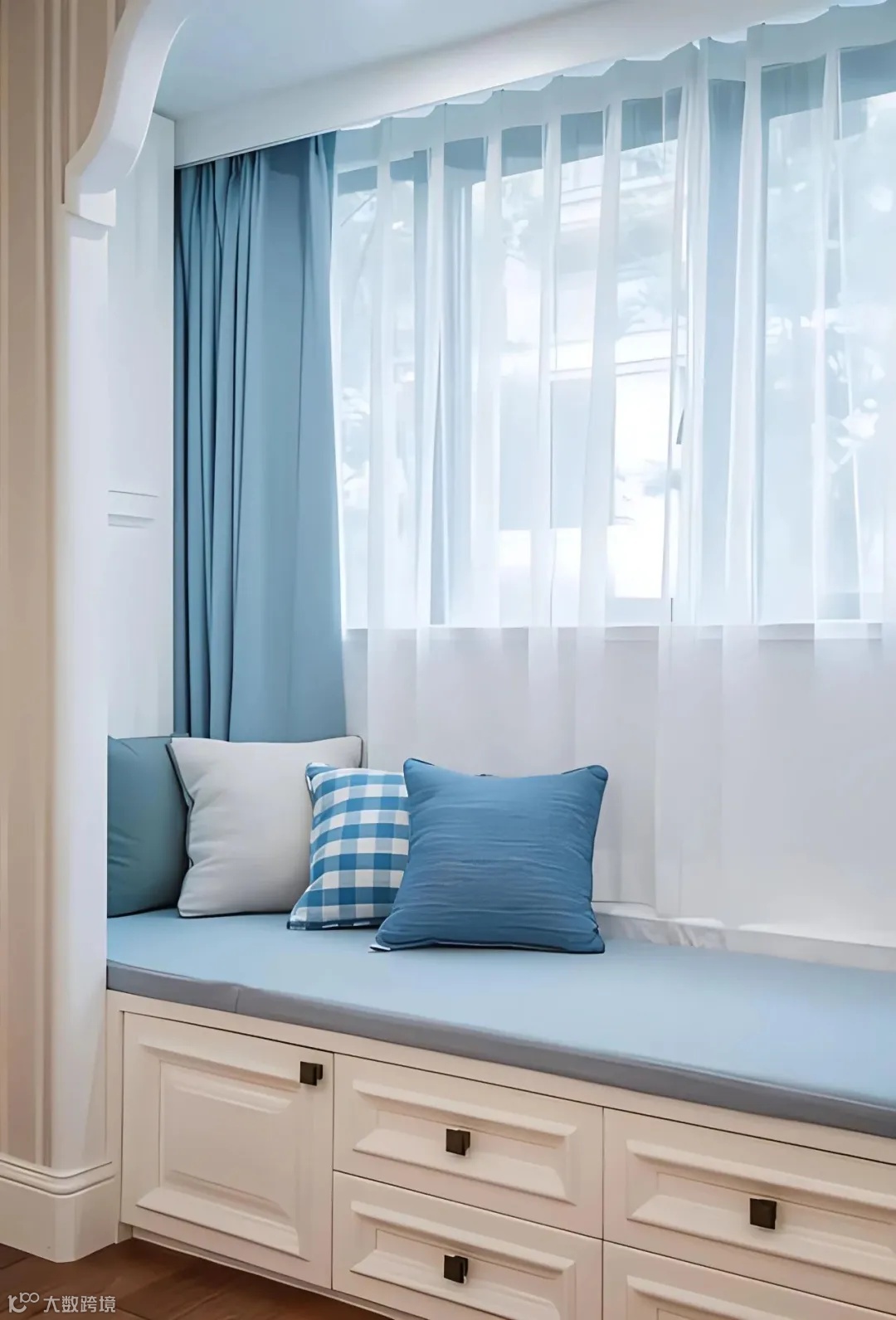 而为了避免飘窗被暴晒,可以在飘窗的内部安装上纱帘,把窗帘和纱帘给分开,拉开窗帘之后就是一个舒适惬意的休闲区。