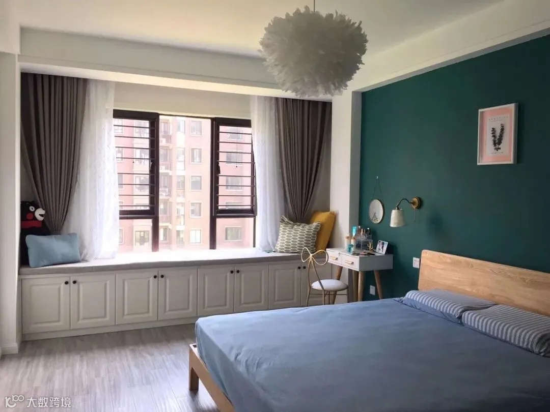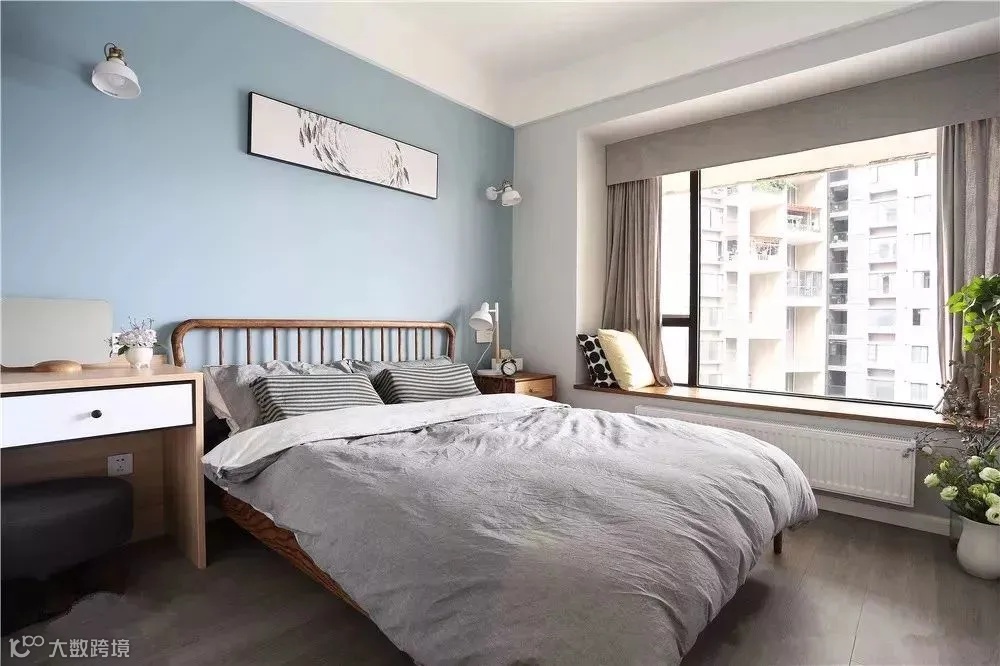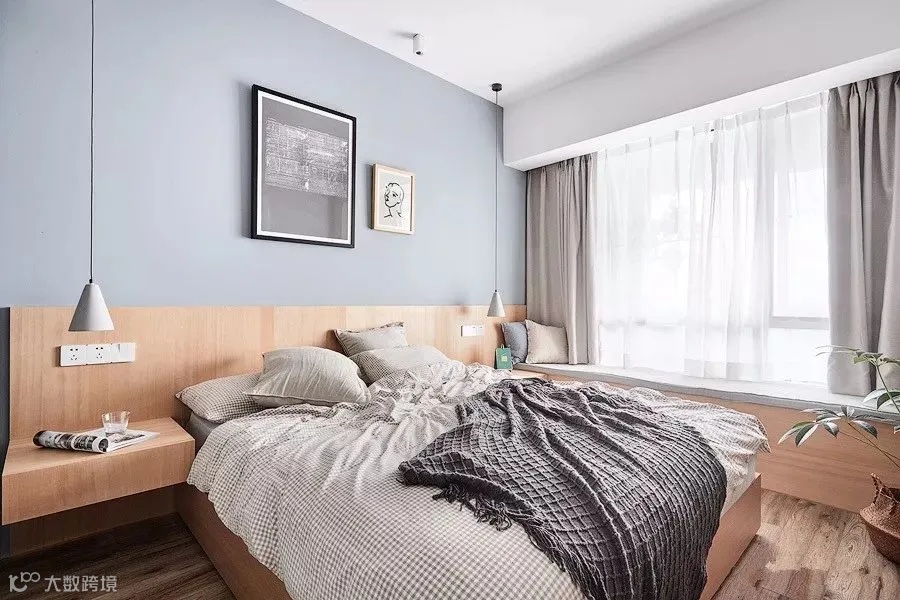 窗帘依靠窗户安装,使得飘窗的深度完全呈现在卧室内,给卧室带来更好的进深感,使卧室空间更有层次。